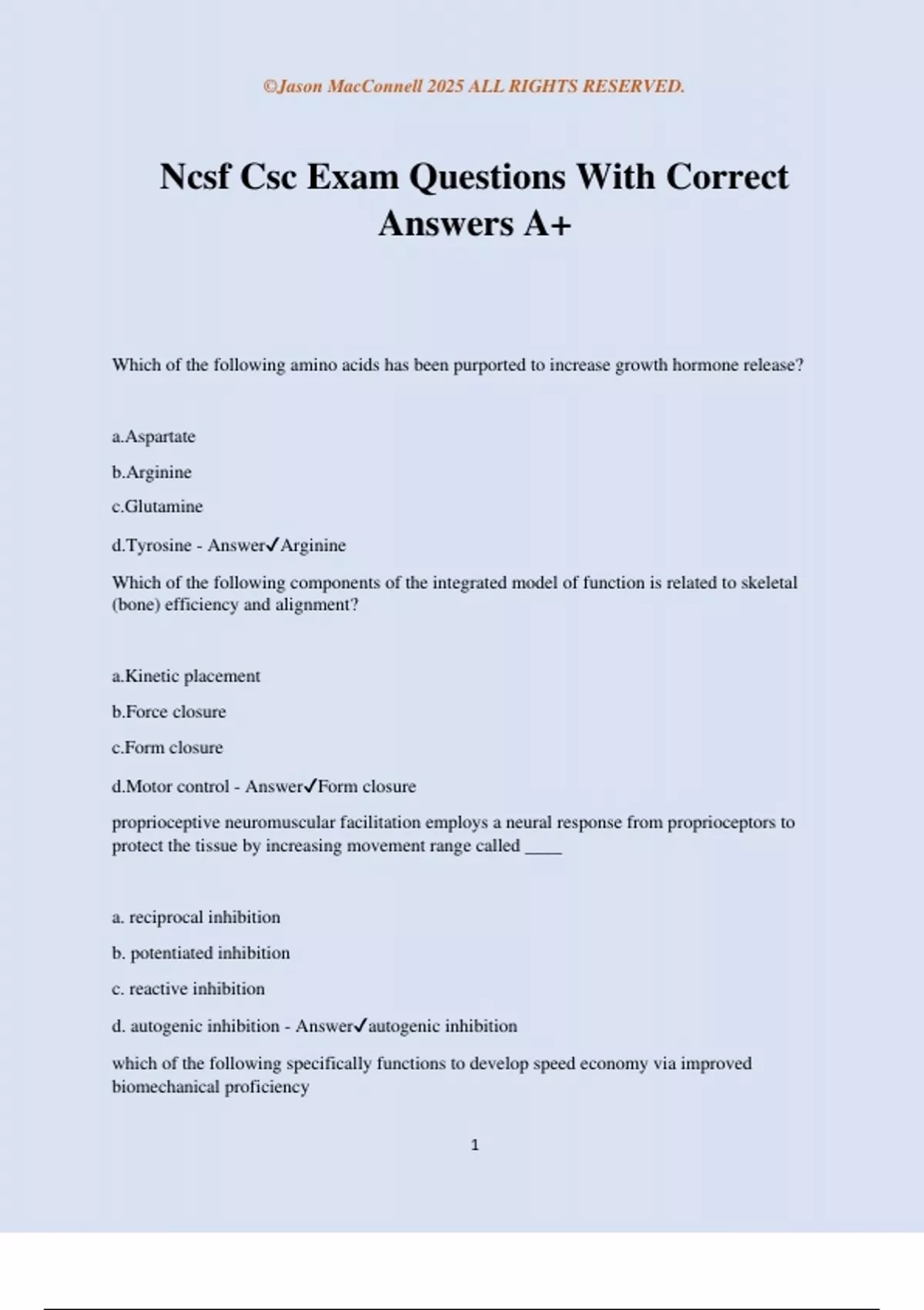 Ncsf Csc Exam Questions With Correct Answers A+ Which of the following amino acids has been purported to increase growth hormone release? a.Aspartate b.Arginine c.Glutamine d.Tyrosine - AnswerArginine Which of the following components of the integrated model of function is related to skeletal (bone) efficiency and alignment? a.Kinetic placement b.Force closure c.Form closure d.Motor control - AnswerForm closure proprioceptive neuromuscular facilitation employs a neural response from proprioceptors to protect the tissue by increasing movement range called ____ a. reciprocal inhibition b. potentiated inhibition c. reactive inhibition d. autogenic inhibition - Answerautogenic inhibition which of the following specifically functions to develop speed economy via improved biomechanical proficiency ©Jason MacConnell 2025 ALL RIGHTS RESERVED. 2 a. overspeed training drills b. plyometric drills c. speed technique drills d. drag training drills - Answerspeed technique drills Which of the following presents the appropriate ranges for essential body fat among men and women? a. Men - 1-3%, women - 7-9% b. Men - 4-8%, women - 8-12% c. Men - 3-5%, women - 11-14% d. Men - 5-9%, women - 9-15% - AnswerMen - 3-5%, women - 11-14% Which of the following is used to determine daily energy expenditure associated with physical activities? a.Metabolic equivalents (METs) b.The rate-pressure product (RPP) c.Maximal heart rate (HRmax) d.Respiration quotient (RQ) - AnswerMetabolic equivalents (METs) Which of the following is purported to be effective for inducing hyperhydration before exercise in the heat? a. Acai berry b. Glycerol c. Beetroot d. GABA - AnswerGlycerol Which of the following is not associated with the use of probiotics as a dietary supplement? a. An improved rate of recovery from rotavirus diarrhea