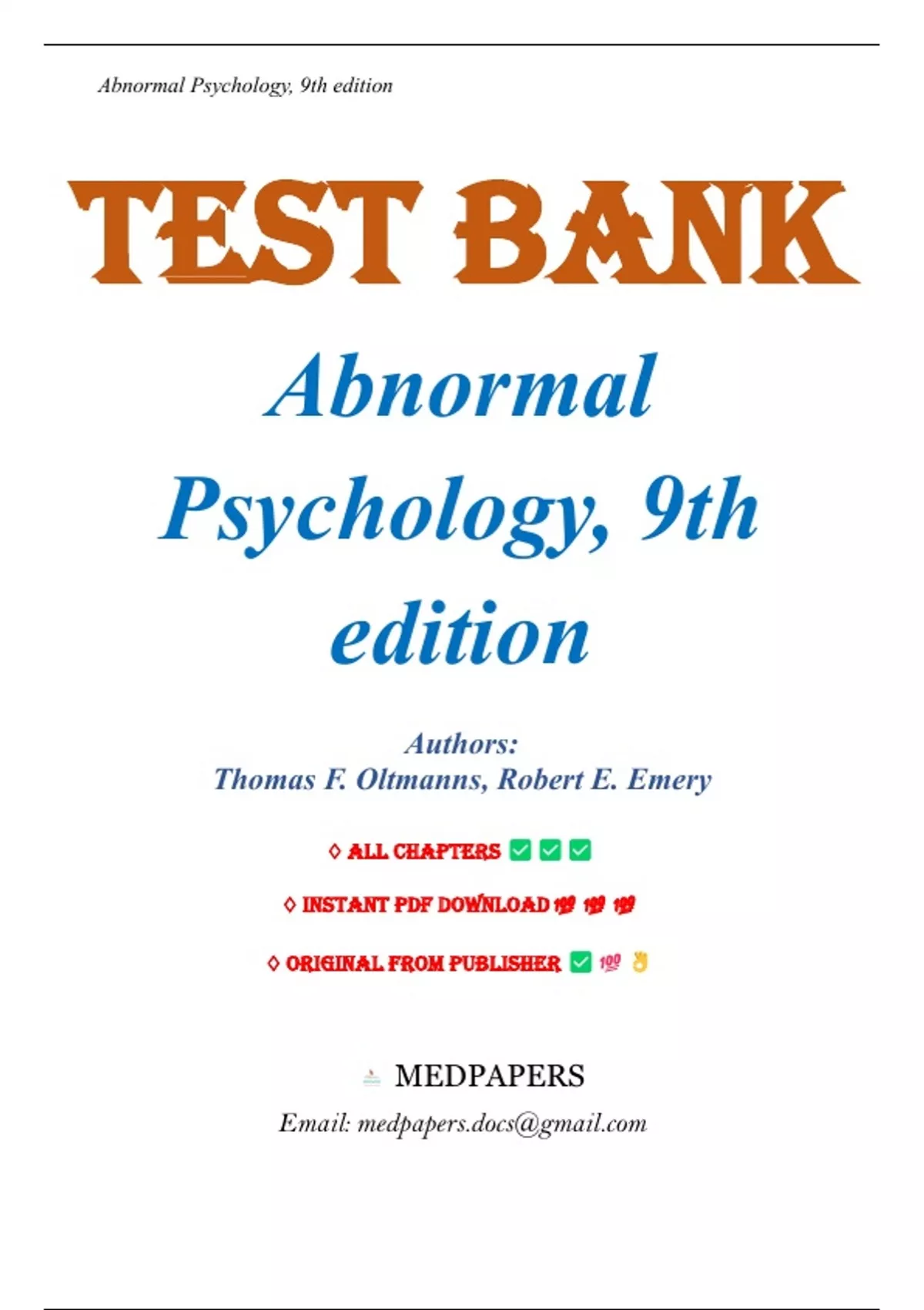Test Bank for Abnormal Psychology 9e 9th Edition by Thomas F. Oltmanns, Robert E. Emery ISBN-13: 1830 Full chapters test bank PDF 1. Examples and Definitions of Abnormal Behavior 2. Causes of Abnormal Behavior 3. Treatment of Psychological Disorders 4. Classification and Assessment of Abnormal Behavior 5. Mood Disorders and Suicide 6. Anxiety Disorders and Obsessive-Compulsive Disorder 7. Acute and Posttraumatic Stress Disorders, Dissociative Disorders, and Somatic Symptom Disorders 8. Stress and Physical Health 9. Personality Disorders 10. Feeding and Eating Disorders 11. Substance-Related and Addictive Disorders 12. Sexual Dysfunctions, Paraphilic Disorders, and Gender Dysphoria 13. Schizophrenia Spectrum and Other Psychotic Disorders 14. Neurocognitive Disorders 15. Intellectual Disabilities and Autism Spectrum Disorders 16. Psychological Disorders of Childhood 17. Adjustment Disorders and Life-Cycle Transitions 18. Mental Health and The Law