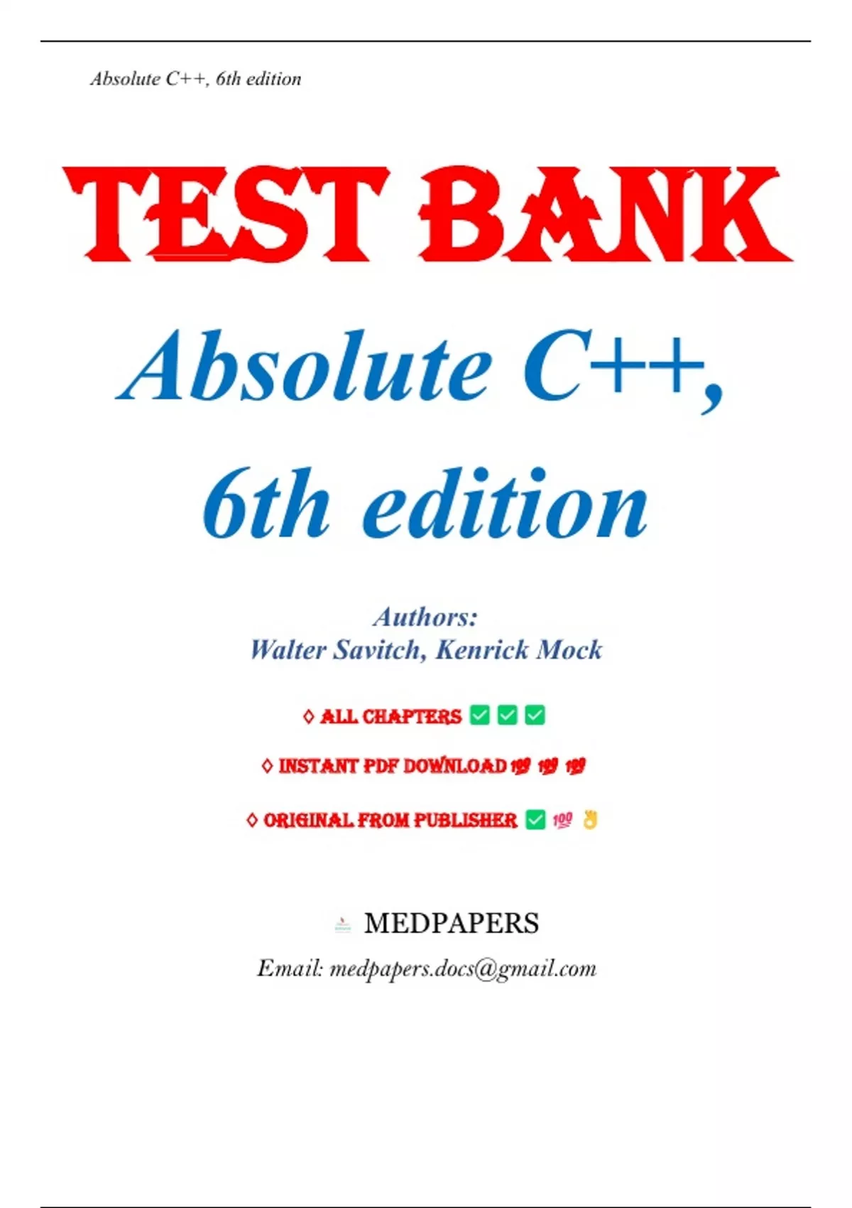 Test Bank - Absolute C++ 6th Edition (Savitch, 2015). Chapters 1-20. Full Chapters Include;....Chapter 1 C++ BASICS 1 Chapter 2 FLOW OF CONTROL 45 Chapter 3 FUNCTION BASICS 99 Chapter 4 PARAMETERS AND OVERLOADING 145 Chapter 5 ARRAYS 185 Chapter 6 STRUCTURES AND CLASSES 239 Chapter 7 CONSTRUCTORS AND OTHER TOOLS 275 Chapter 8 OPERATOR OVERLOADING, FRIENDS, AND REFERENCES 321 Chapter 9 STRINGS 367 Chapter 10 POINTERS AND DYNAMIC ARRAYS 419 Chapter 11 SEPARATE COMPILATION AND NAMESPACES 471 Chapter 12 STREAMS AND FILE I/O 515 Chapter 13 RECURSION 571 Chapter 14 INHERITANCE 613 Chapter 15 POLYMORPHISM AND VIRTUAL FUNCTIONS 661 Chapter 16 TEMPLATES 693 Chapter 17 LINKED DATA STRUCTURES 731 Chapter 18 EXCEPTION HANDLING 825 Chapter 19 STANDARD TEMPLATE LIBRARY 857 Chapter 20 PATTERNS AND UML