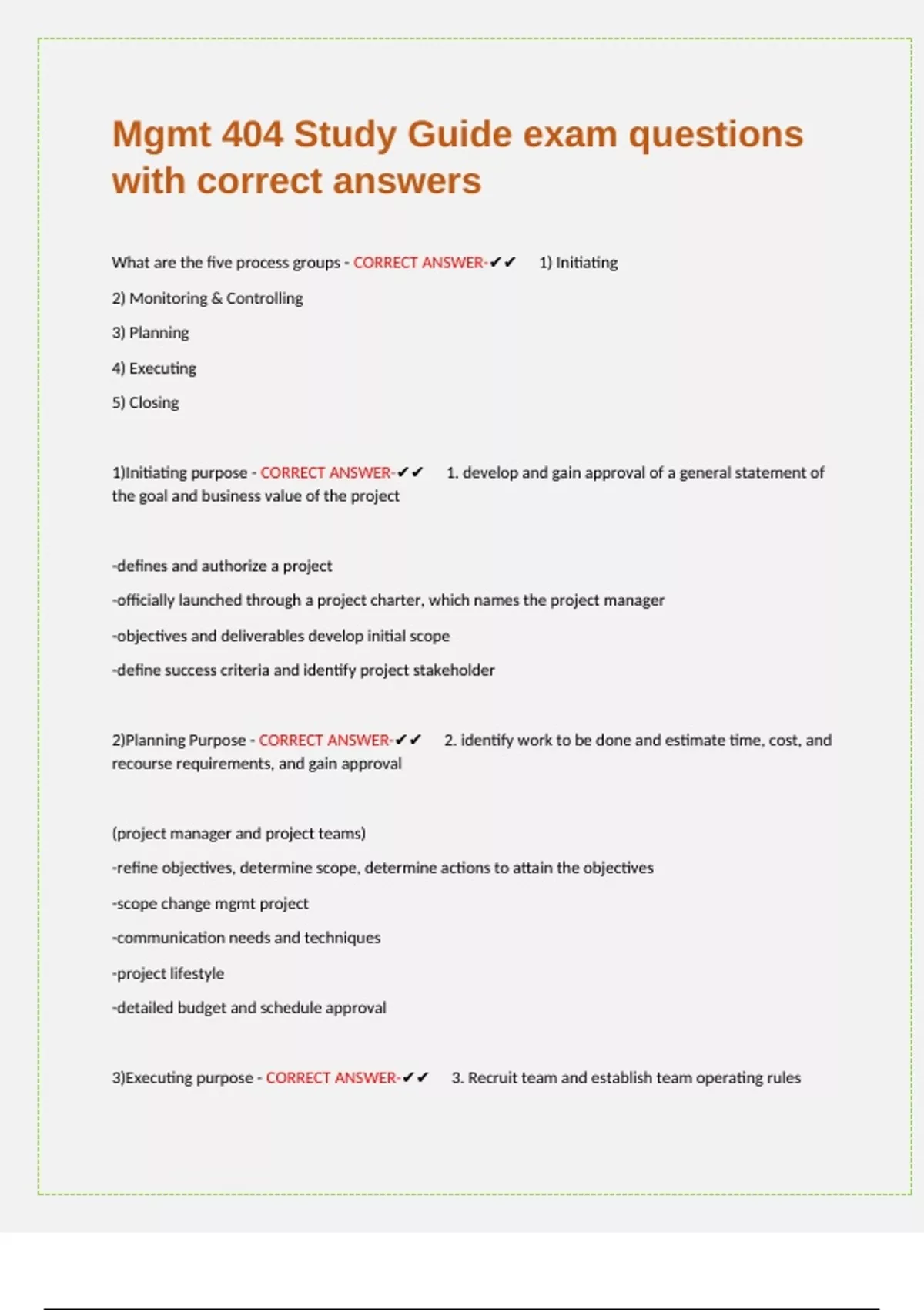 1)Initiating purpose - CORRECT ANSWER-✔✔✅1. develop and gain approval of a general statement of