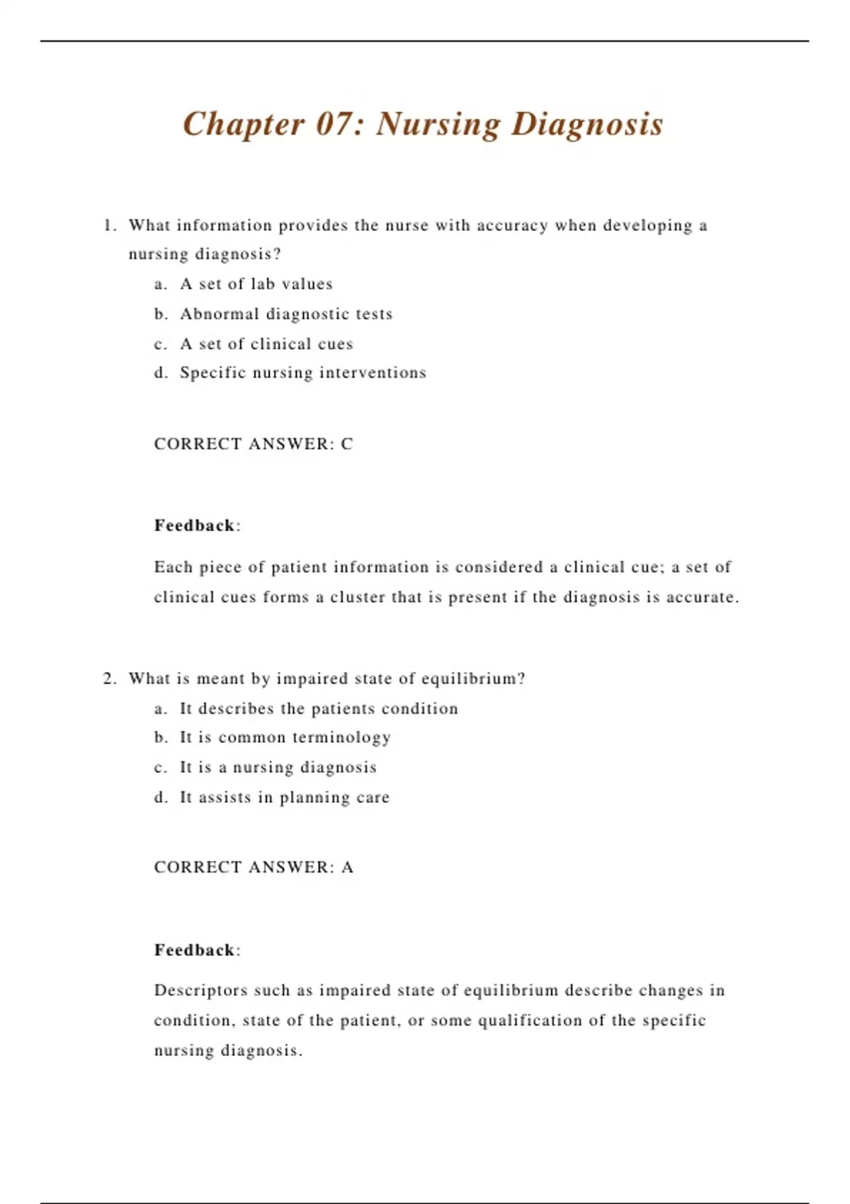 1. What information provides the nurse with accuracy when developing a nursing diagnosis? a. A set of lab values b. Abnormal diagnostic tests c. A set of clinical cues d. Specific nursing interventions CORRECT ANSWER: C Feedback: Each piece of patient information is considered a clinical cue; a set of clinical cues forms a cluster that is present if the diagnosis is accurate. 2. What is meant by impaired state of equilibrium? a. It describes the patients condition b. It is common terminology c. It is a nursing diagnosis d. It assists in planning care CORRECT ANSWER: A Feedback: Descriptors such as impaired state of equilibrium describe changes in condition, state of the patient, or some qualification of the specific nursing diagnosis. 3. What gives additional meaning to a nursing diagnosis? a. Composition b. Descriptors c. Dysfunction d. Qualifications