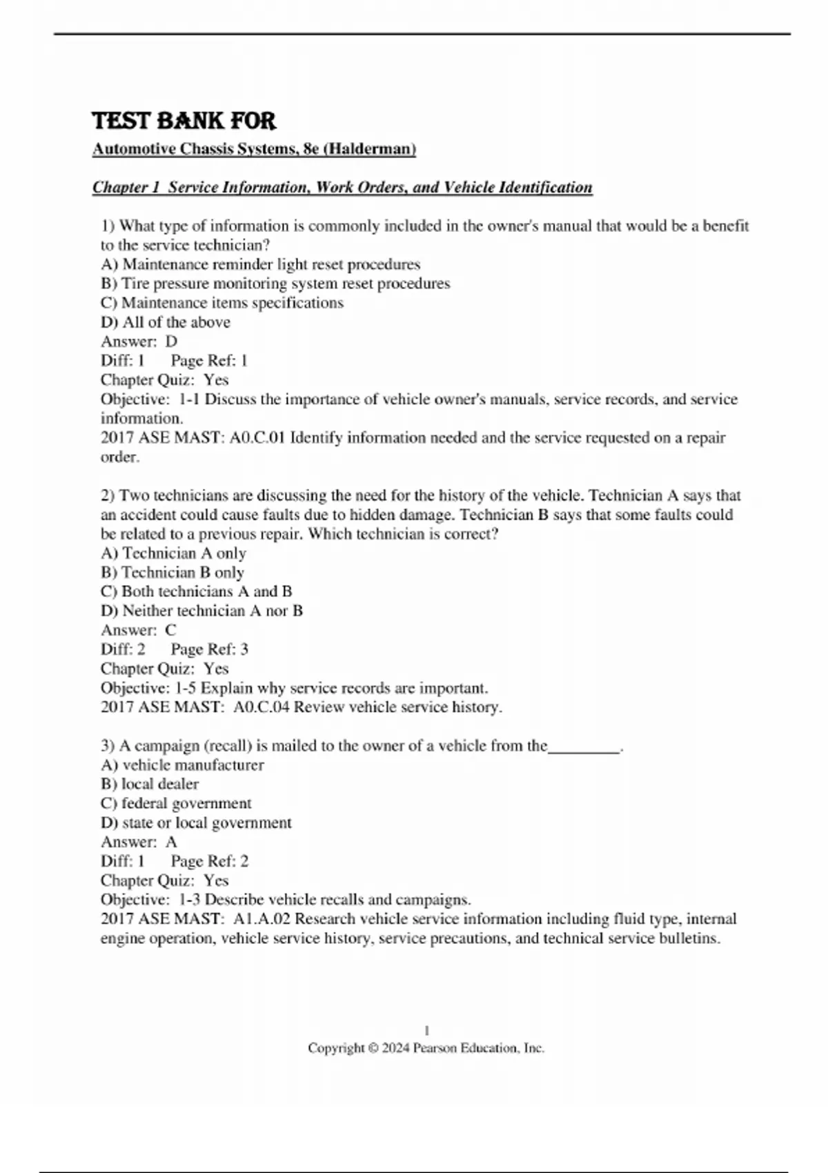 Test Bank for Automotive Chassis Systems 8th Edition, (Halderman,2020), Chapter 1-37 | All Chapters