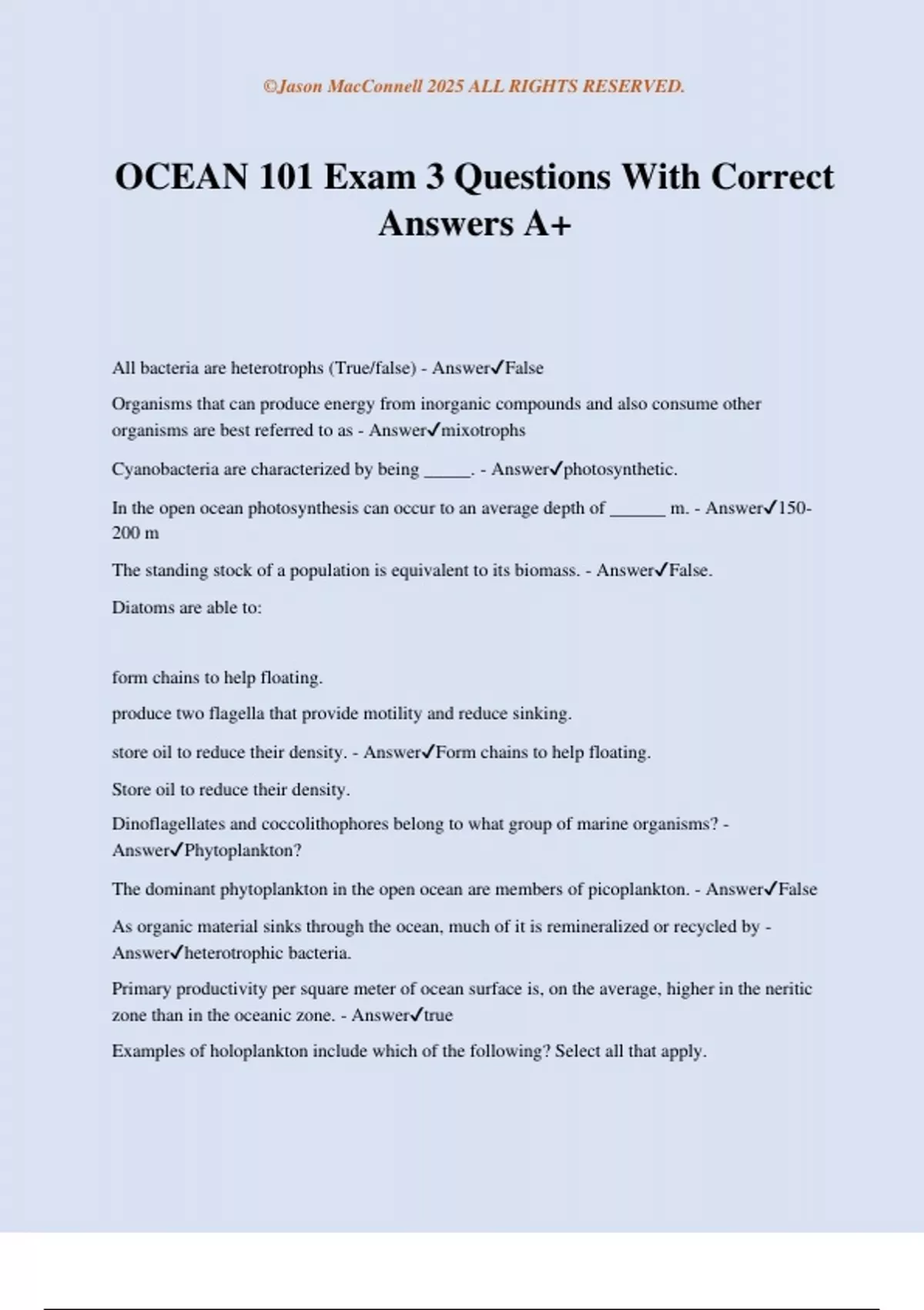 OCEAN 101 Exam 3 Questions With Correct Answers A+ All bacteria are heterotrophs (True/false) - AnswerFalse Organisms that can produce energy from inorganic compounds and also consume other organisms are best referred to as - Answermixotrophs Cyanobacteria are characterized by being _____. - Answerphotosynthetic. In the open ocean photosynthesis can occur to an average depth of ______ m. - Answer150- 200 m The standing stock of a population is equivalent to its biomass. - AnswerFalse. Diatoms are able to: form chains to help floating. produce two flagella that provide motility and reduce sinking. store oil to reduce their density. - AnswerForm chains to help floating. Store oil to reduce their density. Dinoflagellates and coccolithophores belong to what group of marine organisms? - AnswerPhytoplankton? The dominant phytoplankton in the open ocean are members of picoplankton. - AnswerFalse As organic material sinks through the ocean, much of it is remineralized or recycled by - Answerheterotrophic bacteria. Primary productivity per square meter of ocean surface is, on the average, higher in the neritic zone than in the oceanic zone. - Answertrue Examples of holoplankton include which of the following? Select all that apply. ©Jason MacConnell 2025 ALL RIGHTS RESERVED. crab zooea euphausiids copepods amphipods. - AnswerEuphausiids Copepods Amphipods Which of the following is gelatinous holoplankton? Select all that apply. salps radiolarians ctenophores cnidarians copepods - AnswerSalps, ctenophores, cnidarians. Zooplankton are: - AnswerAnimals (hetertrophes) that cannot swim against horizontal ocean currents. The larval stages of species that later become free swimmers or benthic species are called: - AnswerMeroplankton True or False? Zooplankton are non-motile (sessile) - AnswerFalse. Sessile organisms live attached to the seafloor. - AnswerTrue Animals that live on bits and pieces of organic material washed in from the sea or off the land are called - Answerdetritus feeders. Animals that burrow into the seafloor are members of the epifauna. - AnswerFalse Most animals that live within the sand and mud feed on detritus. - AnswerTrue Species of epifauna are less abundant than species of infauna. - AnswerFalse Sessile organisms live attached to the seafloor. - AnswerTrue Animals that live on bits and pieces of organic material washed in from the sea or off the land are called - Answerdetritus feeders. Animals that burrow into the seafloor are members of the epifauna. - AnswerFalse