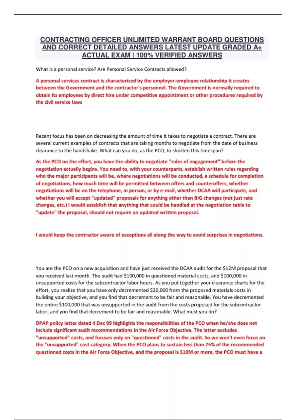 CONTRACTING OFFICER UNLIMITED WARRANT BOARD QUESTIONS AND CORRECT DETAILED ANSWERS LATEST UPDATE GRADED A+ ACTUAL EXAM | 100% VERIFIED ANSWERS What is a personal service? Are Personal Service Contracts allowed? A personal services contract is characterized by the employer-employee relationship it creates between the Government and the contractor's personnel. The Government is normally required to obtain its employees by direct hire under competitive appointment or other procedures required by the civil service laws Recent focus has been on decreasing the amount of time it takes to negotiate a contract. There are several current examples of contracts that are taking months to negotiate from the date of business clearance to the handshake. What can you do, as the PCO, to shorten this timespan? As the PCO on the effort, you have the ability to negotiate "rules of engagement" before the negotiation actually begins. You need to, with your counterparts, establish written rules regarding who the major participants will be, where negotiations will be conducted, a schedule for completion of negotiations, how much time will be permitted between offers and counteroffers, whether negotiations will be on the telephone, in person, or by e-mail, whether DCAA will participate, and whether you will accept "updated" proposals for anything other than BIG changes (not just rate changes, etc.) I would establish that anything that could be handled at the negotiation table to "update" the proposal, should not require an updated written proposal. I would keep the contractor aware of exceptions all along the way to avoid surprises in negotiations. You are the PCO on a new acquisition and have just received the DCAA audit for the $12M proposal that you received last month. The audit had $100,000 in questioned material costs, and $100,000 in unsupported costs for the subcontractor labor hours. As you put together your clearance charts for the effort, you realize that you have only decremented $30,000 from the proposed materials costs in building your objective, and you find that decrement to be fair and reasonable. You have decremented the entire $100,000 that was unsupported in the audit from the costs proposed for the subcontractor labor, and you find that decrement to be fair and reasonable. What must you do? DPAP policy letter dated 4 Dec 09 highlights the responsibilities of the PCO when he/she does not include significant audit recommendations in the Air Force Objective. The letter excludes "unsupported" costs, and focuses only on "questioned" costs in the audit. So we won't even focus on the "unsupported" cost category. When the PCO plans to sustain less than 75% of the recommended questioned costs in the Air Force Objective, and the proposal is $10M or more, the PCO must have a discussion with the auditor and document the disagreement in writing to the auditor, and through business clearance before negotiations! If business clearance is approved, then the disagreement is supported. If the auditor doesn't agree with the decision of the PCO, and the subsequent approval by the Clearance Approval Authority, then DCAA may request a higher level review, which could go all the way to DPAP. In our case, our proposal is over $10M, and the only 30% of the questioned costs were sustained by the PCO. Unless the PCO upholds at least $75,000 of the $100,000 in questioned costs, he/she will have to discuss why not with the auditor, document that in the business clearance, and possibly defend his/her decision at a level all the way up to DPAP. When the contracting officer properly issues a unilateral change under the Changes clause, what responsibility, if any, does the contractor have to continue performance? The contractor must continue performance of the contract as changed, except that in costreimbursement or incrementally funded contracts the contractor is not obligated to continue performance or incur costs beyond the limits established in the Limitation of Cost (fully funded) or Limitation of Funds (incrementally funded) clause. Describe what a warranty provides and describe its use in a cost-reimbursement type contract? Authority: FAR 46.702(b) / FAR 46.705(a) / DFARS 246.705 • Generally, a warranty provides a contractual right for the correction of defects notwithstanding any other requirement of the contract pertaining to acceptance of the supplies or services by the Government; and a stated period of time or use, or the occurrence of a specified event, after acceptance by the Government to assert a contractual right for the correction of defects. • Except for the warranties in the clauses at 52.246-3, Inspection of Supplies -- Cost-Reimbursement, and 52.246-8, Inspection of Research and Development -- Cost-Reimbursement, the contracting officer shall not include warranties in cost-reimbursement contracts. • DFARS gives one other exception to the rule against using warranties in cost-reimbursement contracts: Clause for Warranty of Data. How is a warranty impacted if the Government specifies or doesn't specify the design of the item? If the Government specifies the design of the end item and its measurements, tolerances, materials, tests, or inspection requirements, the contractor's obligations for correction of defects is usually be limited to defects in material and workmanship or failure to conform to specifications. If the Government does not specify the design, the warranty extends also to the usefulness of the design. Where is profit allowed and not allowed under a fixed-price contract terminated for convenience? Profit is allowed on preparations made and work done by the contractor for the terminated portion of the contract but not on the settlement expenses. Anticipatory profits and consequential damages are not allowed. Profit is not allowed for material or services that, as of the effective date of termination, have not been delivered by a subcontractor, regardless of the percentage of completion.