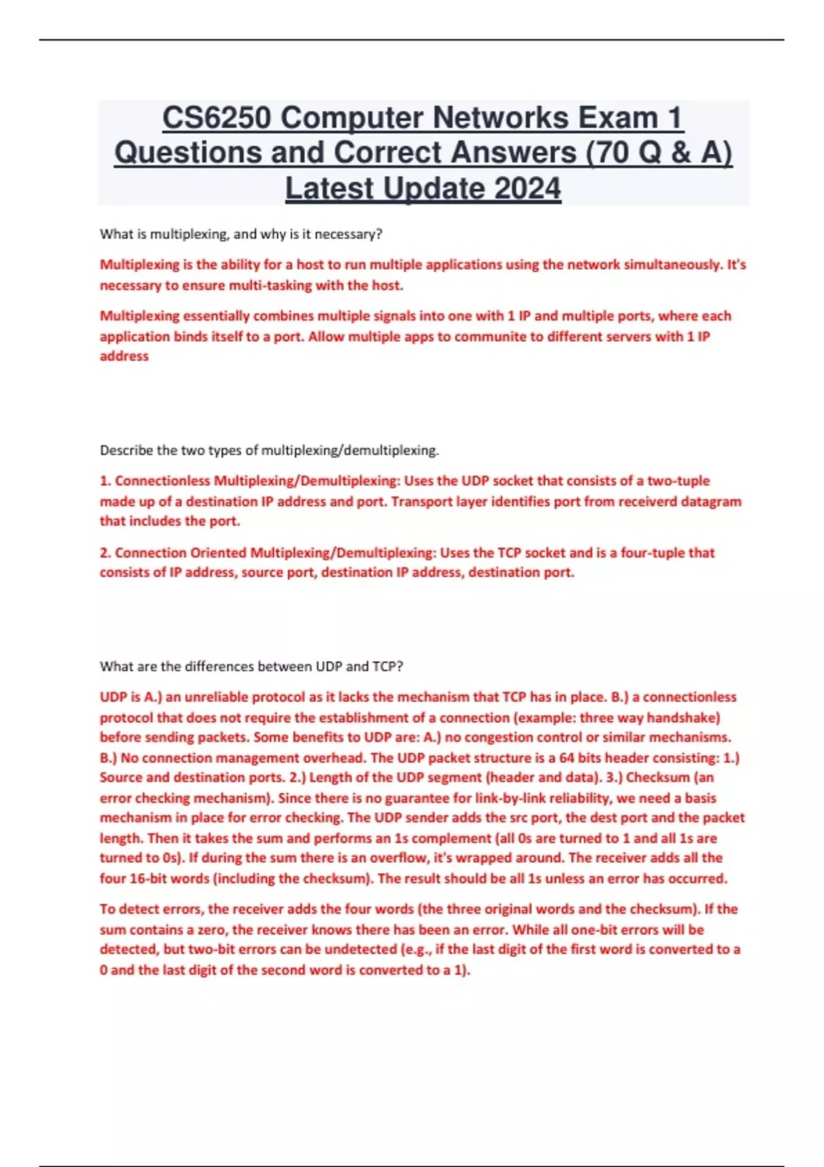 CS6250 Computer Networks Exam 1 Questions and Correct Answers (70 Q & A) Latest Update 2025 What is multiplexing, and why is it necessary? Multiplexing is the ability for a host to run multiple applications using the network simultaneously. It's necessary to ensure multi-tasking with the host. Multiplexing essentially combines multiple signals into one with 1 IP and multiple ports, where each application binds itself to a port. Allow multiple apps to communite to different servers with 1 IP address Describe the two types of multiplexing/demultiplexing. 1. Connectionless Multiplexing/Demultiplexing: Uses the UDP socket that consists of a two-tuple made up of a destination IP address and port. Transport layer identifies port from receiverd datagram that includes the port. 2. Connection Oriented Multiplexing/Demultiplexing: Uses the TCP socket and is a four-tuple that consists of IP address, source port, destination IP address, destination port. What are the differences between UDP and TCP? UDP is A.) an unreliable protocol as it lacks the mechanism that TCP has in place. B.) a connectionless protocol that does not require the establishment of a connection (example: three way handshake) before sending packets. Some benefits to UDP are: A.) no congestion control or similar mechanisms. B.) No connection management overhead. The UDP packet structure is a 64 bits header consisting: 1.) Source and destination ports. 2.) Length of the UDP segment (header and data). 3.) Checksum (an error checking mechanism). Since there is no guarantee for link-by-link reliability, we need a basis mechanism in place for error checking. The UDP sender adds the src port, the dest port and the packet length. Then it takes the sum and performs an 1s complement (all 0s are turned to 1 and all 1s are turned to 0s). If during the sum there is an overflow, it's wrapped around. The receiver adds all the four 16-bit words (including the checksum). The result should be all 1s unless an error has occurred. To detect errors, the receiver adds the four words (the three original words and the checksum). If the sum contains a zero, the receiver knows there has been an error. While all one-bit errors will be detected, but two-bit errors can be undetected (e.g., if the last digit of the first word is converted to a 0 and the last digit of the second word is converted to a 1). TCP is a protocol consisting of a three-way handshake and a connection teardown: 3-way Handshake: Step 1: The TCP client sends a special segment, (containing no data) and with SYN bit set to 1. The Client also generates an initial sequence number (client_isn) and includes it in this special TCP SYN segment. Step 2: The Server upon receiving this packet, allocates the required resources for the connection and sends back the special 'connection-granted' segment which we call SYNACK. This packet has SYN bit set to 1, ack field containing (client_isn+1) value and a randomly chosen initial sequence number in the sequence number field. Step 3: When the client receives the SYNACK segment, it also allocates buffer and resources for the connection and sends an acknowledgment with SYN bit set to 0. Teardown: Step 1: When client wants to end the connection, it sends a segment with FIN bit set to 1 to the server. Step 2: Server acknowledges that it has received the connection closing request and is now working on closing the connection. Step 3: The Server then sends a segment with FIN bit set to 1, indicating that connection is closed. Step 4: The Client sends an ACK for it to the server. It also waits for sometime to resend this acknowledgment in case the first ACK segment is lost. When would an application layer protocol choose UDP over TCP? When developers need just a simple mechanism for transmission control. Typically, use UDP in applications where speed is more critical than reliability. For example, it may be better to use UDP in an application sending data from a fast acquisition where it is acceptable to lose some data points. You can also use UDP to broadcast to any machine(s) listening to the server. 20use%20UDP%20in%20applications,s)%20listening%20to%20the%20server. Explain the TCP Three-way Handshake. 3-way Handshake: Step 1: The TCP client sends a special segment, (containing no data) and with SYN bit set to 1. The Client also generates an initial sequence number (client_isn) and includes it in this special TCP SYN segment. Step 2: The Server upon receiving this packet, allocates the required resources for the connection and sends back the special 'connection-granted' segment which we call SYNACK. This packet has SYN bit set to 1, ack field containing (client_isn+1) value and a randomly chosen initial sequence number in the sequence number field. Step 3: When the client receives the SYNACK segment, it also allocates buffer and resources for the connection and sends an acknowledgment with SYN bit set to 0