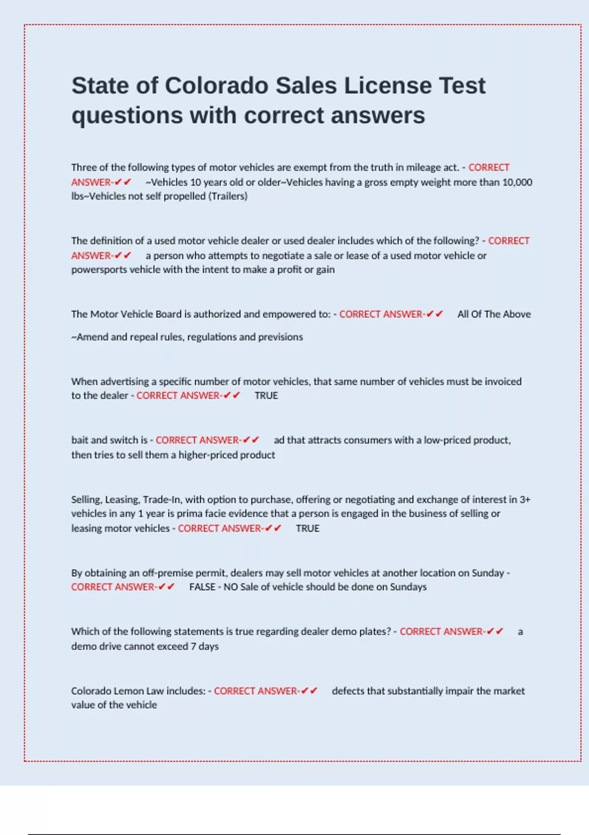 CORRECT ANSWER-✔✔✅FALSE - NO Sale of vehicle should be done on Sundays