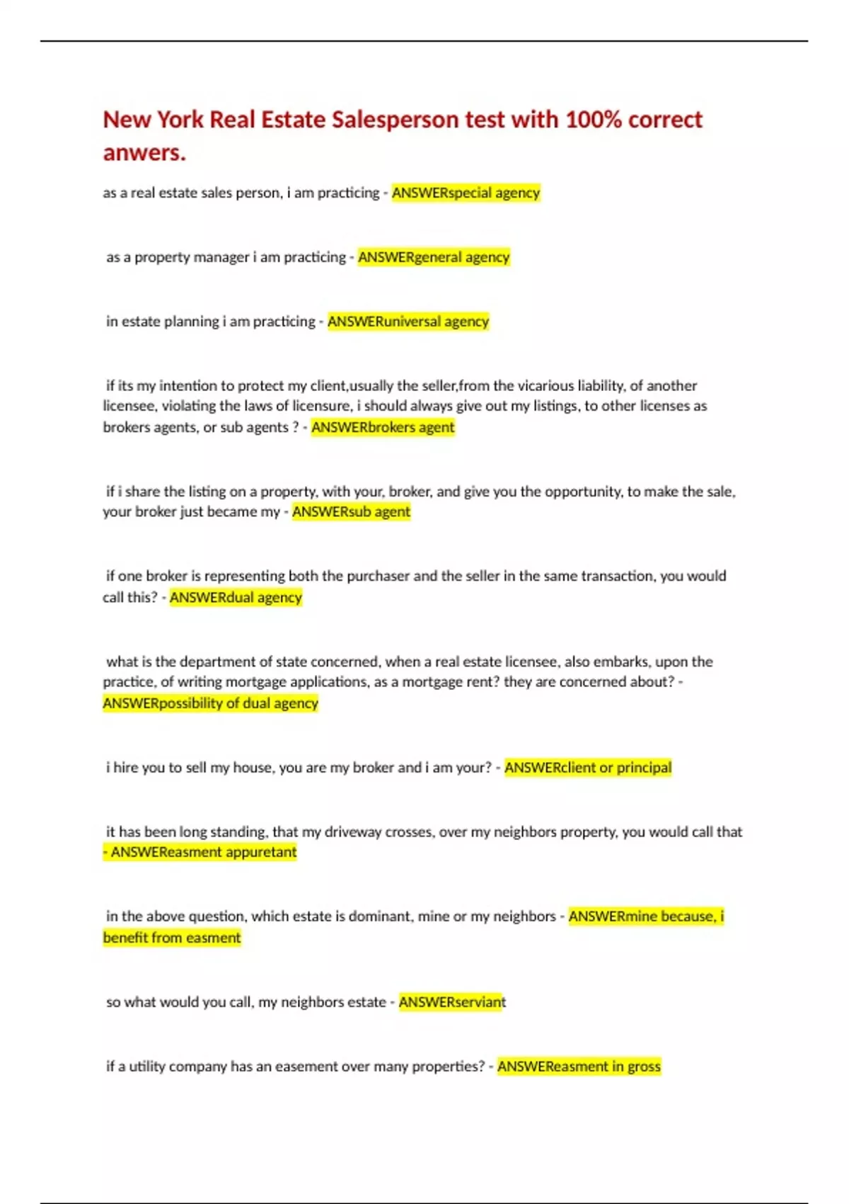 New York Real Estate Salesperson test with 100% correct anwers. as a real estate sales person, i am practicing - ANSWERspecial agency as a property manager i am practicing - ANSWERgeneral agency in estate planning i am practicing - ANSWERuniversal agency if its my intention to protect my client,usually the seller,from the vicarious liability, of another licensee, violating the laws of licensure, i should always give out my listings, to other licenses as brokers agents, or sub agents ? - ANSWERbrokers agent if i share the listing on a property, with your, broker, and give you the opportunity, to make the sale, your broker just became my - ANSWERsub agent if one broker is representing both the purchaser and the seller in the same transaction, you would call this? - ANSWERdual agency what is the department of state concerned, when a real estate licensee, also embarks, upon the practice, of writing mortgage applications, as a mortgage rent? they are concerned about? - ANSWERpossibility of dual agency i hire you to sell my house, you are my broker and i am your? - ANSWERclient or principal it has been long standing, that my driveway crosses, over my neighbors property, you would call that - ANSWEReasment appuretant in the above question, which estate is dominant, mine or my neighbors - ANSWERmine because, i benefit from easment so what would you call, my neighbors estate - ANSWERserviant if a utility company has an easement over many properties? - ANSWEReasment in gross utility easment if someone uses the property of another in a way that is open and notorious, exclusive and adverse to the best interest of the true owner, you would call this? - ANSWERsquatter rights what are two other names in the questions above? - ANSWERadverse posession easement by prescription for how many years would you have use of that persons property to make claim of ownership? - ANSWER10 years if a person has the right to cross over your property its an? - ANSWEReasment if a thing is crossing over your property line thats an? - ANSWERencroachment if you buy materials from a supply house, and fail to pay them, they can file a materialmens line, unfortunately this student told materialmens lien isn't one of the choices - ANSWERmechanics lien we talked about, a formal legal description, of an vld, what is one example, of a formal legal description? - ANSWERsection block and lot meet and bounds which description would not be formal legal description - ANSWERstreet name and street address who determines, what the real estate commission, will be on a particular deal? - ANSWERsponsoring broker and client(seller) if someone dies without having a valid will, he died? - ANSWERintestate if someone dies w/out having a valid will and the state cannot locate any heirs or creditors, that persons property reverts to the state through a process called? - ANSWERescheat