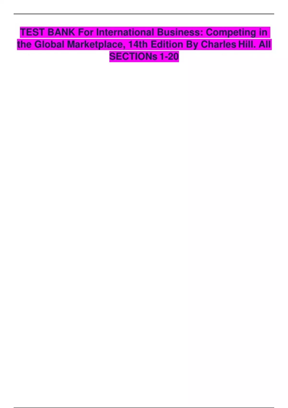 TEST BANK For International Business: Competing in the Global Marketplace, 14th Edition By Charles Hill. All Chapters 1-20. (Complete Download) Updated A+ TABLE OF CONTENT 1. Globalization 2. National Differences in Political Economy 3. Politi cal Economy and Economic Development 4. Differences in Culture 5. Ethics in International Business 6. International Trade Theory 7. The Political Economy of International Trade 8. Foreign Direct Investment 9. Regional Economic Integration 10. The Foreign Exchange Market 11. The International Monetary System 12. The Global Capital Market 13. The Strategy of International Business 14. The Organization of International Business 15. Entry Strategy and Strategic Alliances 16. Exporting, Importing, and Countertrade 17. Global Production, Outsourcing, and Logistics 18. Global Marketing and R&D 19. Global Human Resource Management 20. Accounting and Finance in the International Business