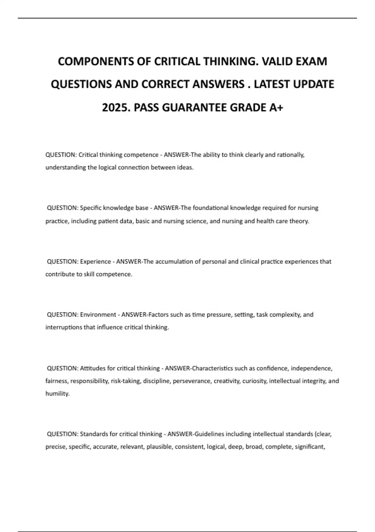 COMPONENTS OF CRITICAL THINKING. VALID EXAM QUESTIONS AND CORRECT ANSWERS . LATEST UPDATE 2025. PASS GUARANTEE GRADE A+
