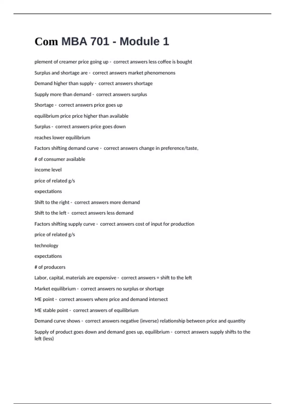 Com MBA 701 - Module 1 plement of creamer price going up - correct answers less coffee is bought Surplus and shortage are - correct answers market phenomenons Demand higher than supply - correct answers shortage Supply more than demand - correct answers surplus Shortage - correct answers price goes up equilibrium price price higher than available Surplus - correct answers price goes down reaches lower equilibrium Factors shifting demand curve - correct answers change in preference/taste, # of consumer available income level price of related g/s expectations Shift to the right - correct answers more demand Shift to the left - correct answers less demand Factors shifting supply curve - correct answers cost of input for production price of related g/s technology expectations # of producers