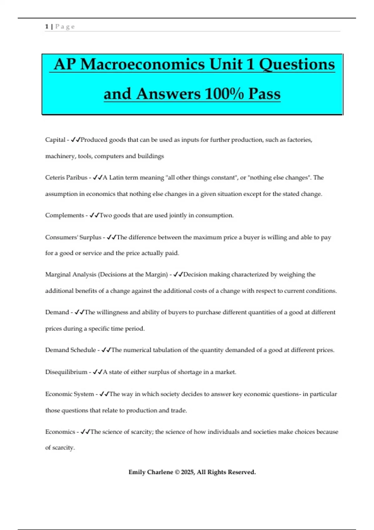 AP Macroeconomics Unit 1 Questions and Answers 100% Pass Capital - Produced goods that can be used as inputs for further production, such as factories, machinery, tools, computers and buildings Ceteris Paribus - A Latin term meaning "all other things constant", or "nothing else changes". The assumption in economics that nothing else changes in a given situation except for the stated change. Complements - Two goods that are used jointly in consumption. Consumers' Surplus - The difference between the maximum price a buyer is willing and able to pay for a good or service and the price actually paid. Marginal Analysis (Decisions at the Margin) - Decision making characterized by weighing the additional benefits of a change against the additional costs of a change with respect to current conditions. Demand - The willingness and ability of buyers to purchase different quantities of a good at different prices during a specific time period. Demand Schedule - The numerical tabulation of the quantity demanded of a good at different prices. Disequilibrium - A state of either surplus of shortage in a market. Economic System - The way in which society decides to answer key economic questions- in particular those questions that relate to production and trade. Economics - The science of scarcity; the science of how individuals and societies make choices because of scarcity. 2 | P a g e Emily Charlene © 2025, All Rights Reserved. Entrerpreneurship - The particular talent that some people have for organizing the resources of land, labor and capitol to produce goods, seek new business opportunities, and develop new ways of doing things. Equilibrium - The price-quantity combination from which there is no tendency for buyers or sellers to move away. Equilibrium Price (Market Clearing Price) - The price at which quantity demanded of the good equals quantity shipped. Equilibrium Quantity - The quantity at which the amount of the good that buyers are willing and able to buy equals the amount that sellers are willing and able to sell, and both equal the amount actually bought and sold. Labor - The physical and mental talents people contribute to the production process. Land - All natural resources, such as minerals, forests, water, a