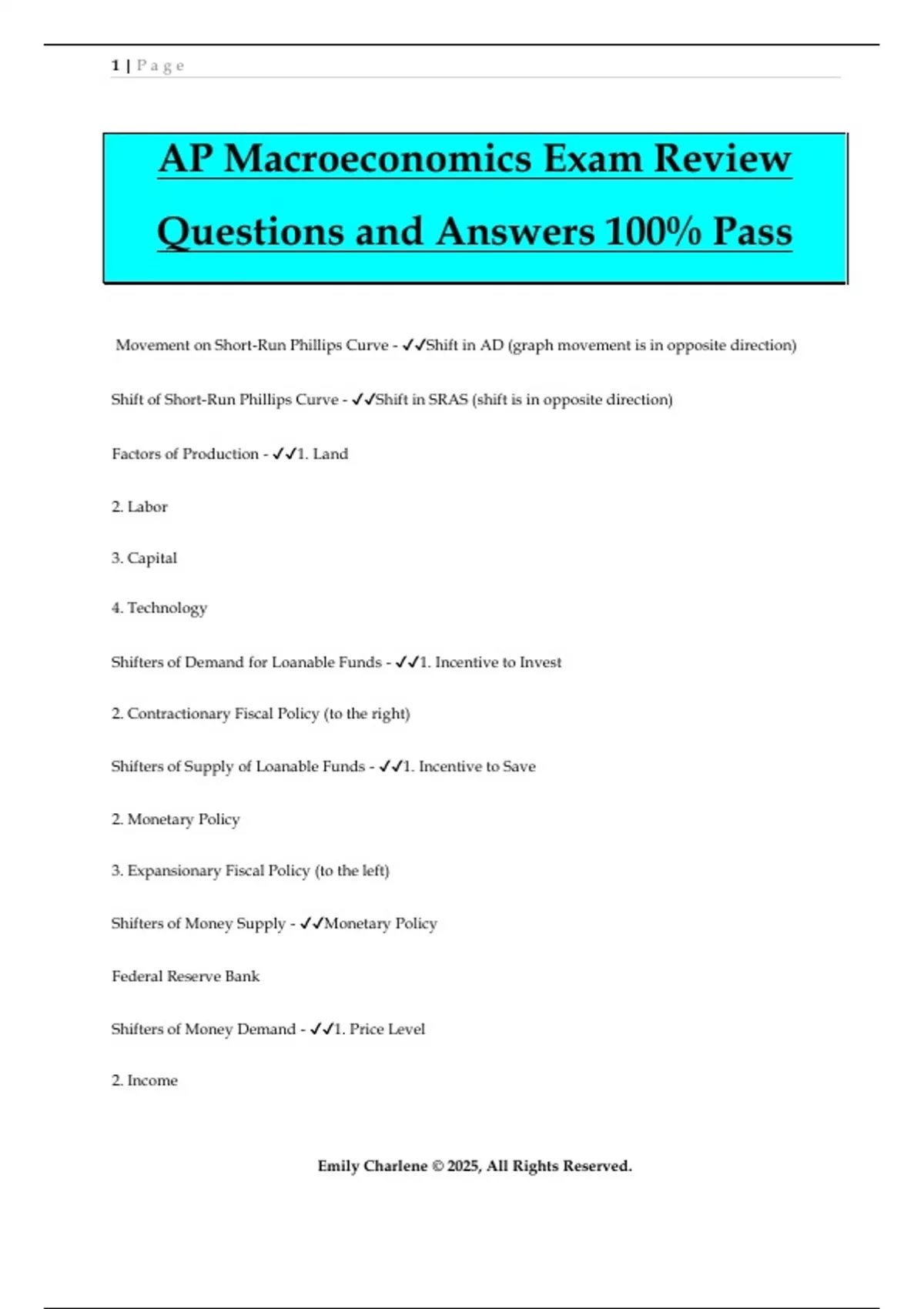 AP Macroeconomics Exam Review Questions and Answers 100% Pass Movement on Short-Run Phillips Curve - Shift in AD (graph movement is in opposite direction) Shift of Short-Run Phillips Curve - Shift in SRAS (shift is in opposite direction) Factors of Production - 1. Land 2. Labor 3. Capital 4. Technology Shifters of Demand for Loanable Funds - 1. Incentive to Invest 2. Contractionary Fiscal Policy (to the right) Shifters of Supply of Loanable Funds - 1. Incentive to Save 2. Monetary Policy 3. Expansionary Fiscal Policy (to the left) Shifters of Money Supply - Monetary Policy Federal Reserve Bank Shifters of Money Demand - 1. Price Level 2. Income 2 | P a g e Emily Charlene © 2025, All Rights Reserved. 3. Fiscal Policy Shifters of Long-Run Aggregate Supply - Increase in Factors of Production Shifters of Short-Run Aggregate Supply - 1. Factors of Production (LRAS) 2. Input Costs 3. Supply Shock Shifters of Aggregate Demand - 1. GDP (or its components) 2. Monetary Policy 3. Fiscal Policy PPC Graph - Illustrates the production possibilities of 2 products based on amount of resources available Demand and Supply Graph - Business Cycle - AD/AS Graph - Money Market Graph - Loanable Funds Graph - GDP = C + I + G + Xn - The expenditure approach to measuring GDP correlates well with aggregate demand (AD) GDP = W + I + R + P - The income approach to measuring GDP correlates well with aggregate supply Calculating Nominal GDP - The quantity of various goods produced in a nation times their current prices, added together. 3 | P a g e Emily Charlene © 2025, All Rights Reserved. GDP Deflator - Price index used to measure inflation Inflation Rate via the CPI - (This year's CPI - Last year's CPI)/(Last year's CPI) x 100. The inflation rate is the percentage change in the CPI from one period to the next. Real Interest Rate - the interest rate corrected for the effects of inflation; Unemployment Rate - 16 or older, actively seeking employme