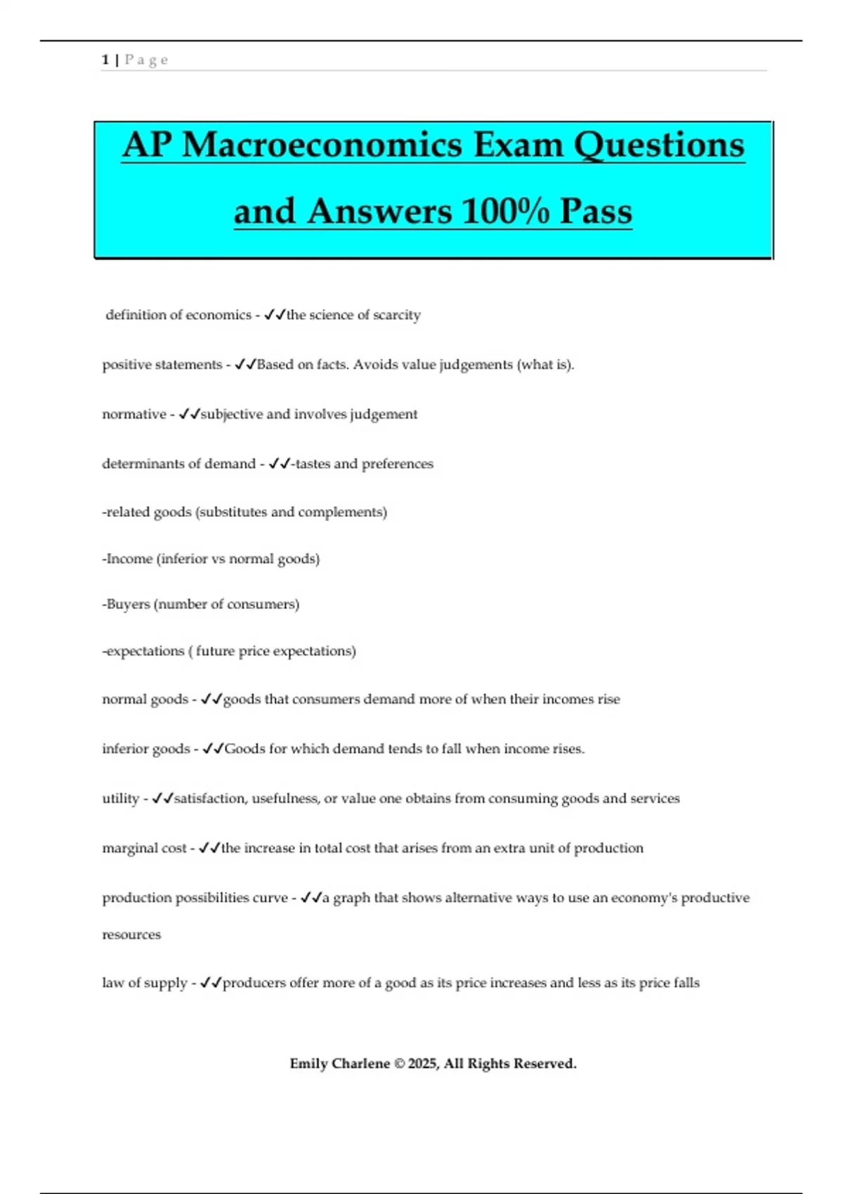 AP Macroeconomics Exam Questions and Answers 100% Pass definition of economics - the science of scarcity positive statements - Based on facts. Avoids value judgements (what is). normative - subjective and involves judgement determinants of demand - -tastes and preferences -related goods (substitutes and complements) -Income (inferior vs normal goods) -Buyers (number of consumers) -expectations ( future price expectations) normal goods - goods that consumers demand more of when their incomes rise inferior goods - Goods for which demand tends to fall when income rises. utility - satisfaction, usefulness, or value one obtains from consuming goods and services marginal cost - the increase in total cost that arises from an extra unit of production production possibilities curve - a graph that shows alternative ways to use an economy's productive resources law of supply - producers offer more of a good as its price increases and less as its price falls 2 | P a g e Emily Charlene © 2025, All Rights Reserved. relationship between price and quantity demanded - inverse (as price increases, demand decreases relationship between price and quantity supplied - direct (as price increases, quantity supplied increases) GDP - -the total market value of all final goods and services produced annually in an economy - C+I+G+Xn unemployment - the number of people who are actively looking for work but aren't currently employed who benefits from inflation? - borrowers and people with a fixed-rate debts Steps of business cycle - expansion, peak, contraction, trough full employment - when all resources are fully utilized, and the employment rate is at its natural rate recession - period of reduced economic activity