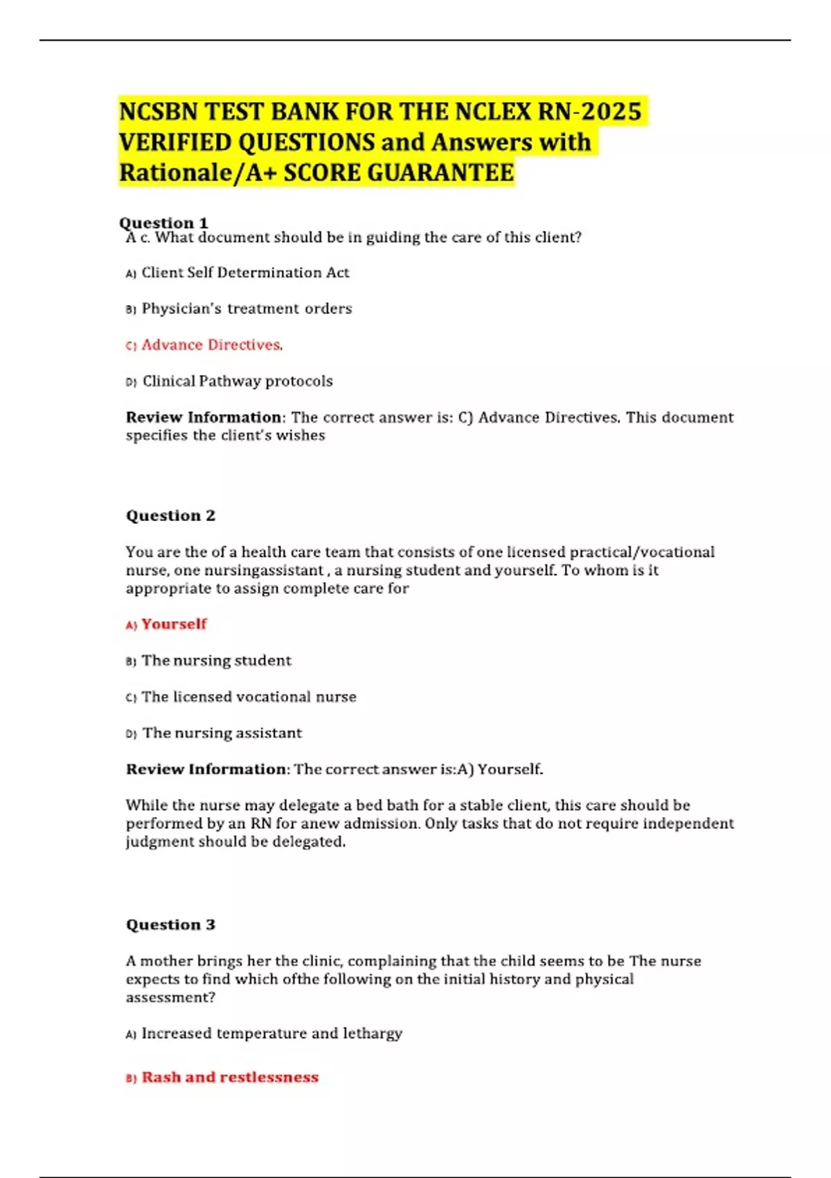 NCSBN TEST BANK FOR THE NCLEX RN-2025 VERIFIED QUESTIONS and Answers with Rationale/A+ SCORE GUARANTEE