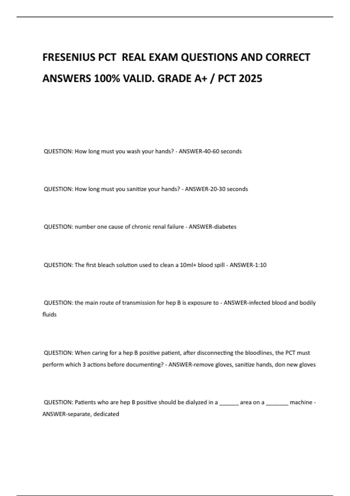 FRESENIUS PCT REAL EXAM QUESTIONS AND CORRECT