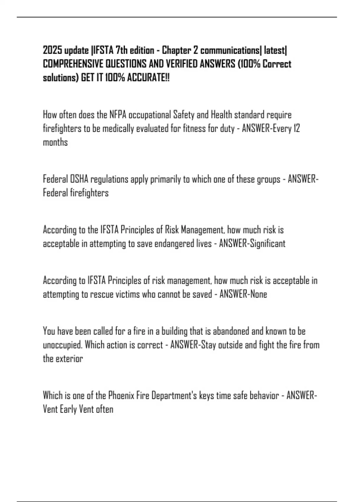2025 update |IFSTA 7th edition - Chapter 2 communications| latest| COMPREHENSIVE QUESTIONS AND VERIFIED ANSWERS (100% Correct solutions) GET IT 100% ACCURATE!! How often does the NFPA occupational Safety and Health standard require firefighters to be medically evaluated for fitness for duty - ANSWER-Every 12 months Federal OSHA regulations apply primarily to which one of these groups - ANSWERFederal firefighters According to the IFSTA Principles of Risk Management, how much risk is acceptable in attempting to save endangered lives - ANSWER-Significant According to IFSTA Principles of risk management, how much risk is acceptable in attempting to rescue victims who cannot be saved - ANSWER-None You have been called for a fire in a building that is abandoned and known to be unoccupied. Which action is correct - ANSWER-Stay outside and fight the fire from the exterior Which is one of the Phoenix Fire Department's keys time safe behavior - ANSWERVent Early Vent often Always watch your fire ground position