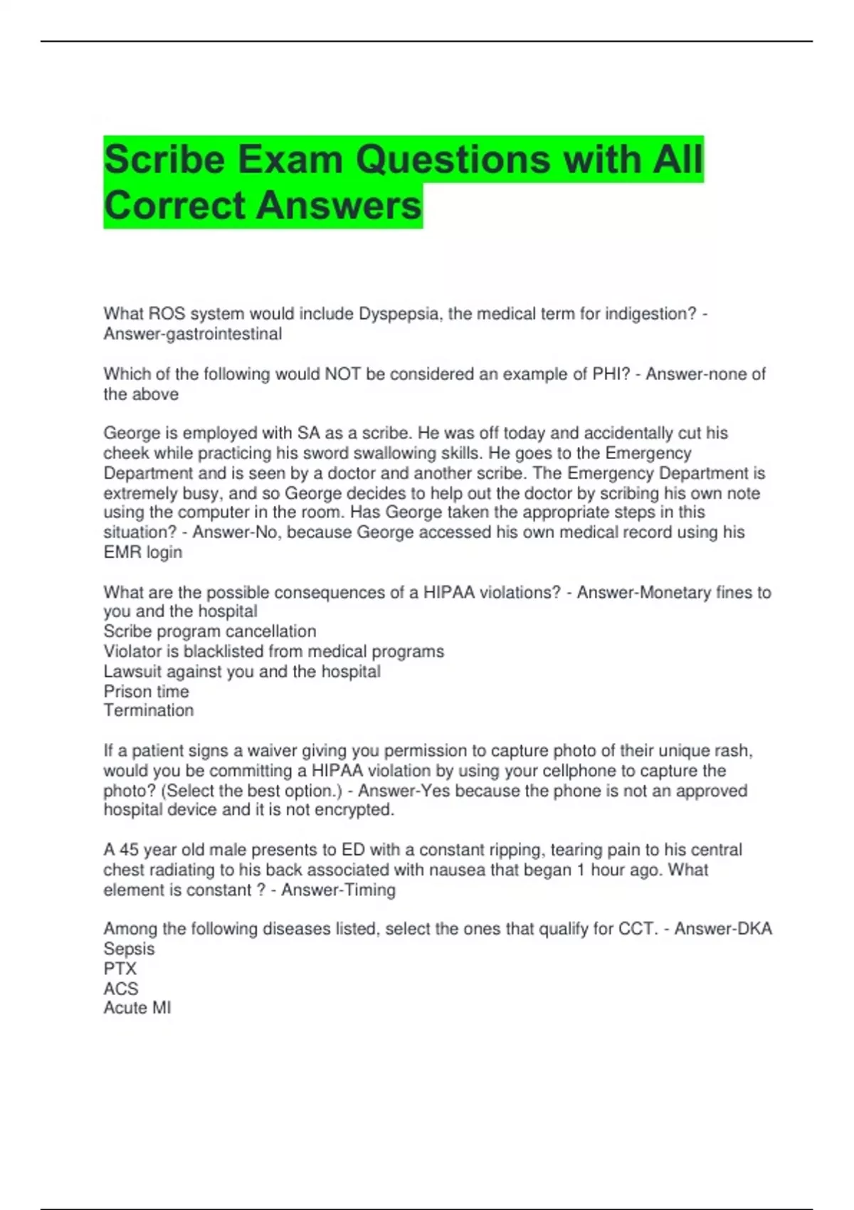 Scribe Exam Questions with All Correct Answers What ROS system would include Dyspepsia, the medical term for indigestion? - Answer-gastrointestinal Which of the following would NOT be considered an example of PHI? - Answer-none of the above George is employed with SA as a scribe. He was off today and accidentally cut his cheek while practicing his sword swallowing skills. He goes to the Emergency Department and is seen by a doctor and another scribe. The Emergency Department is extremely busy, and so George decides to help out the doctor by scribing his own note using the computer in the room. Has George taken the appropriate steps in this situation? - Answer-No, because George accessed his own medical record using his EMR login What are the possible consequences of a HIPAA violations? - Answer-Monetary fines to you and the hospital Scribe program cancellation Violator is blacklisted from medical programs Lawsuit against you and the hospital Prison time Termination If a patient signs a waiver giving you permission to capture photo of their unique rash, would you be committing a HIPAA violation by using your cellphone to capture the photo? (Select the best option.) - Answer-Yes because the phone is not an approved hospital device and it is not encrypted. A 45 year old male presents to ED with a constant ripping, tearing pain to his central chest radiating to his back associated with nausea that began 1 hour ago. What element is constant ? - Answer-Timing Among the following diseases listed, select the ones that qualify for CCT. - Answer-DKA Sepsis PTX ACS Acute MI A-fib with RVR CVA PE What term describes "the patient destination is home"? - Answer-Discharge What abbreviation describes the scenario in which a patient declines a hospital stay and decides to go home instead? - Answer-AMA A 13 y/o male patient was riding his bike earlier today and accidentally fell off after traveling on an uneven patch of sidewalk. He landed onto his outstretched right hand and subsequently experienced localized pain and swelling to the his right wrist. An x-ray of the right wrist shows a distal radial fracture. Now that the results are back, the physician will be ready to discharge the patient home. Which of the following would need to go into this patient's disposition note? - Answer-F/U with specialist or PCP, Specific conditions for return to the ED, Condition at time of disposition, Time period for f/u, Timing of disposition, patient mental capacity What do you need to make sure to document for every admitted patient. - Answer-A consultation note indicating the admitting physician An ED technician informs the provider that they have just finished applying a splint and sling for the patient with the wrist fracture. What PE finding is important for your provider to assess and include in the procedure note before the patient can be discharged home? - Answer-CSMT You've just caught up on all you're charting. What are some things you can do to increase your provider's efficiency? - Answer-Preparing charts for patients that are assign to provider Tracking results Accompanying your provider on revels Preparing for dispositions