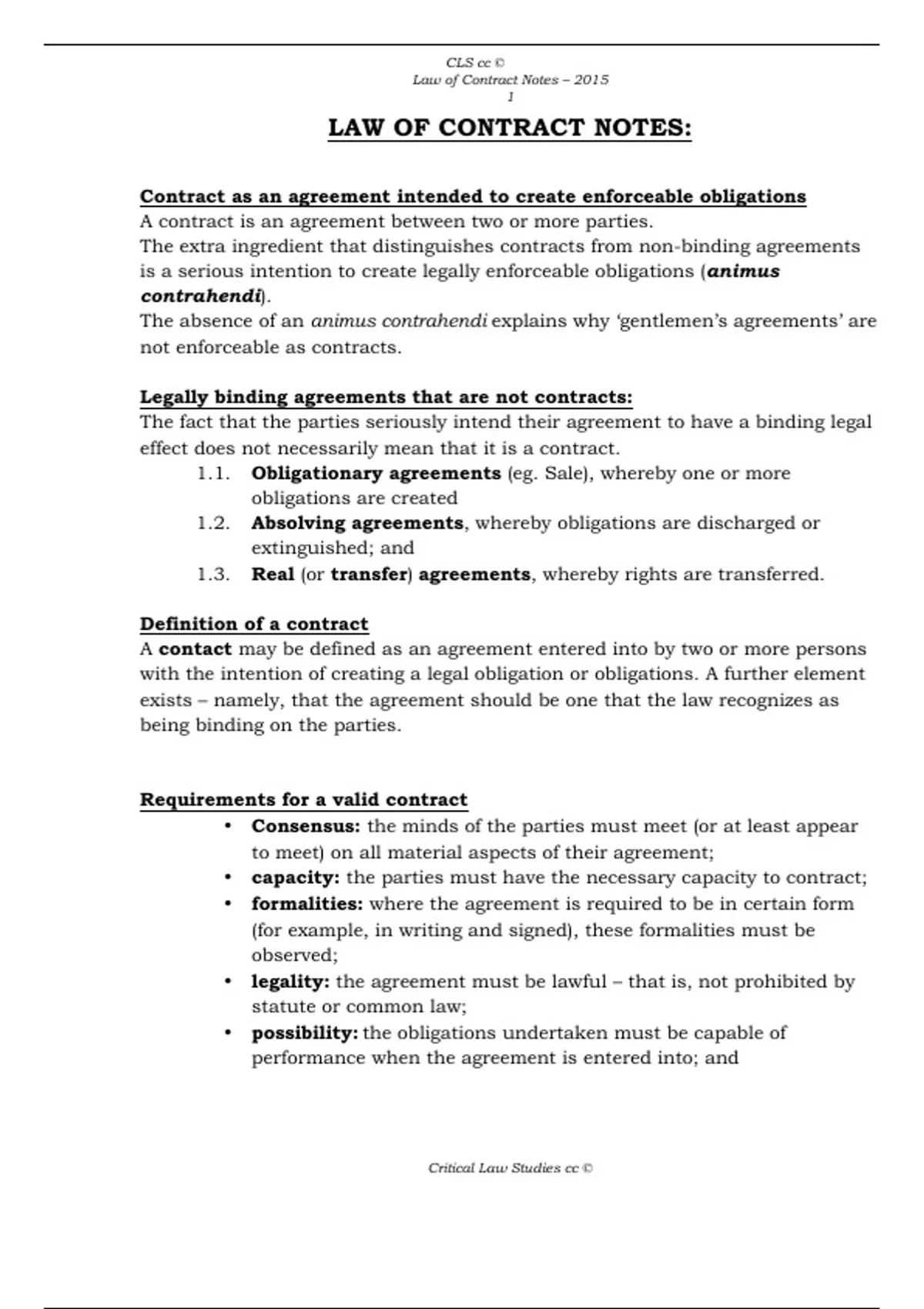 Law of Contract Notes – 2015