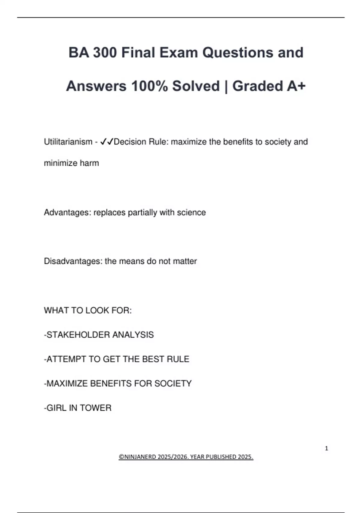 BA 300 Final Exam Questions and Answers 100% Solved | Graded A+ Utilitarianism - Decision Rule: maximize the benefits to society and minimize harm Advantages: replaces partially with science Disadvantages: the means do not matter WHAT TO LOOK FOR: -STAKEHOLDER ANALYSIS -ATTEMPT TO GET THE BEST RULE -MAXIMIZE BENEFITS FOR SOCIETY -GIRL IN TOWER