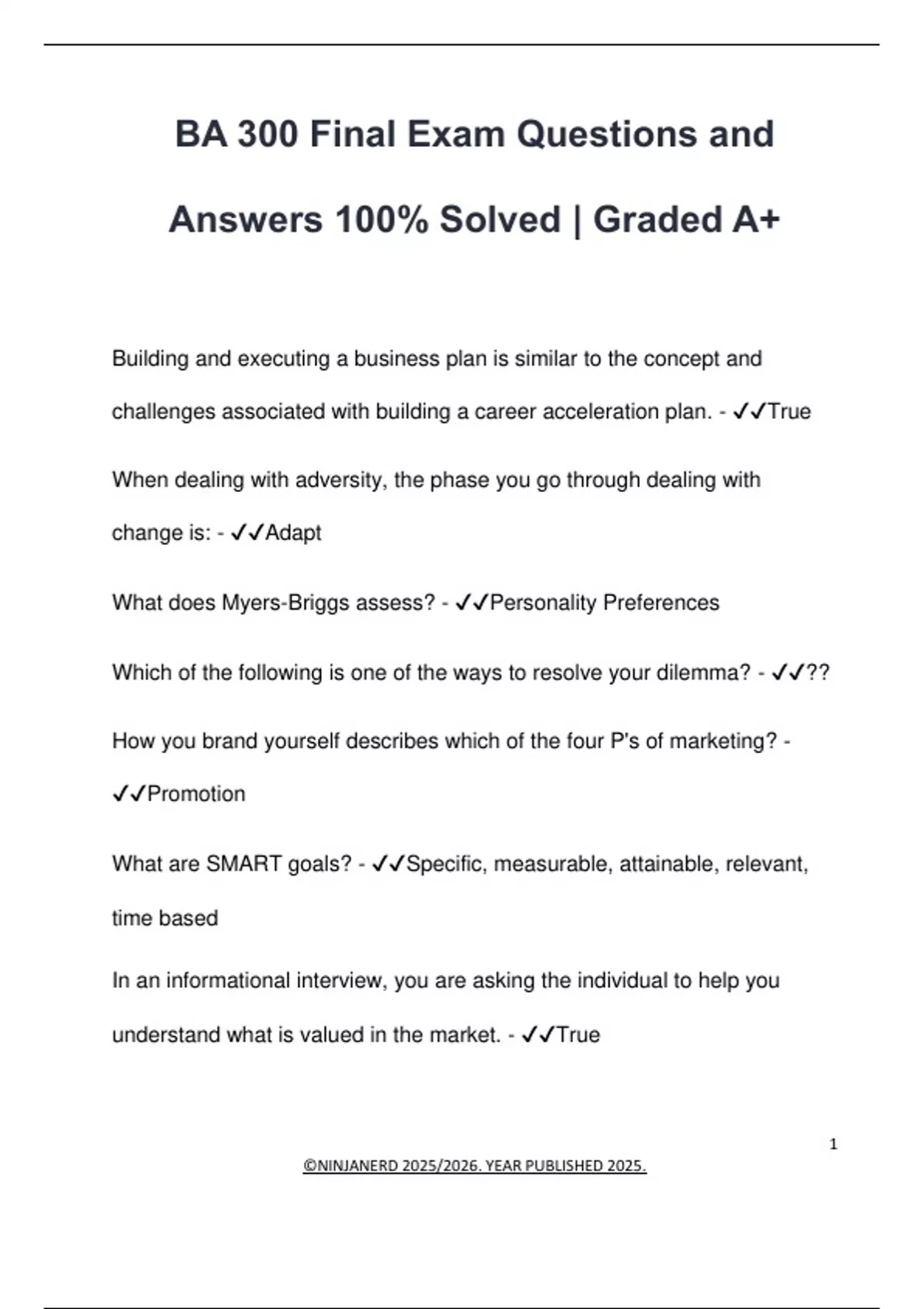 BA 300 Final Exam Questions and Answers 100% Solved | Graded A+ Building and executing a business plan is similar to the concept and challenges associated with building a career acceleration plan. - True When dealing with adversity, the phase you go through dealing with change is: - Adapt What does Myers-Briggs assess? - Personality Preferences Which of the following is one of the ways to resolve your dilemma? - ?? How you brand yourself describes which of the four P's of marketing? - Promotion What are SMART goals? - Specific, measurable, attainable, relevant, time based In an informational interview, you are asking the individual to help you understand what is valued in the market. - True