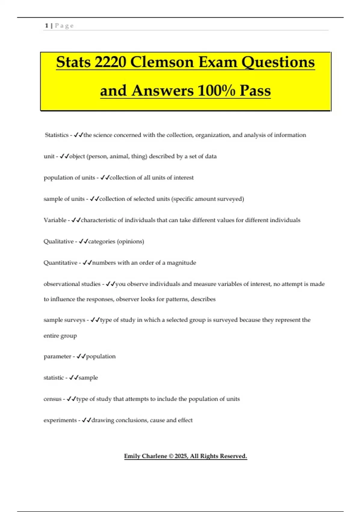 Stats 2220 Clemson Exam Questions and Answers 100% Pass Statistics - the science concerned with the collection, organization, and analysis of information unit - object (person, animal, thing) described by a set of data population of units - collection of all units of interest sample of units - collection of selected units (specific amount surveyed) Variable - characteristic of individuals that can take different values for different individuals Qualitative - categories (opinions) Quantitative - numbers with an order of a magnitude observational studies - you observe individuals and measure variables of interest, no attempt is made to influence the responses, observer looks for patterns, describes sample surveys - type of study in which a selected group is surveyed because they represent the entire group parameter - population statistic - sample census - type of study that attempts to include the population of units experiments - drawing conclusions, cause and effect 2 | P a g e Emily Charlene © 2025, All Rights Reserved. Statistics in Society - Who? Why? How? Guessing - can be an obvious guess, have a component based on guessing, "dark figure" defining - what exactly is the social problem? measuring - definitions influence what will be counted or measured convenience sampling - at the right place at the right time voluntary response sampling - self-selection