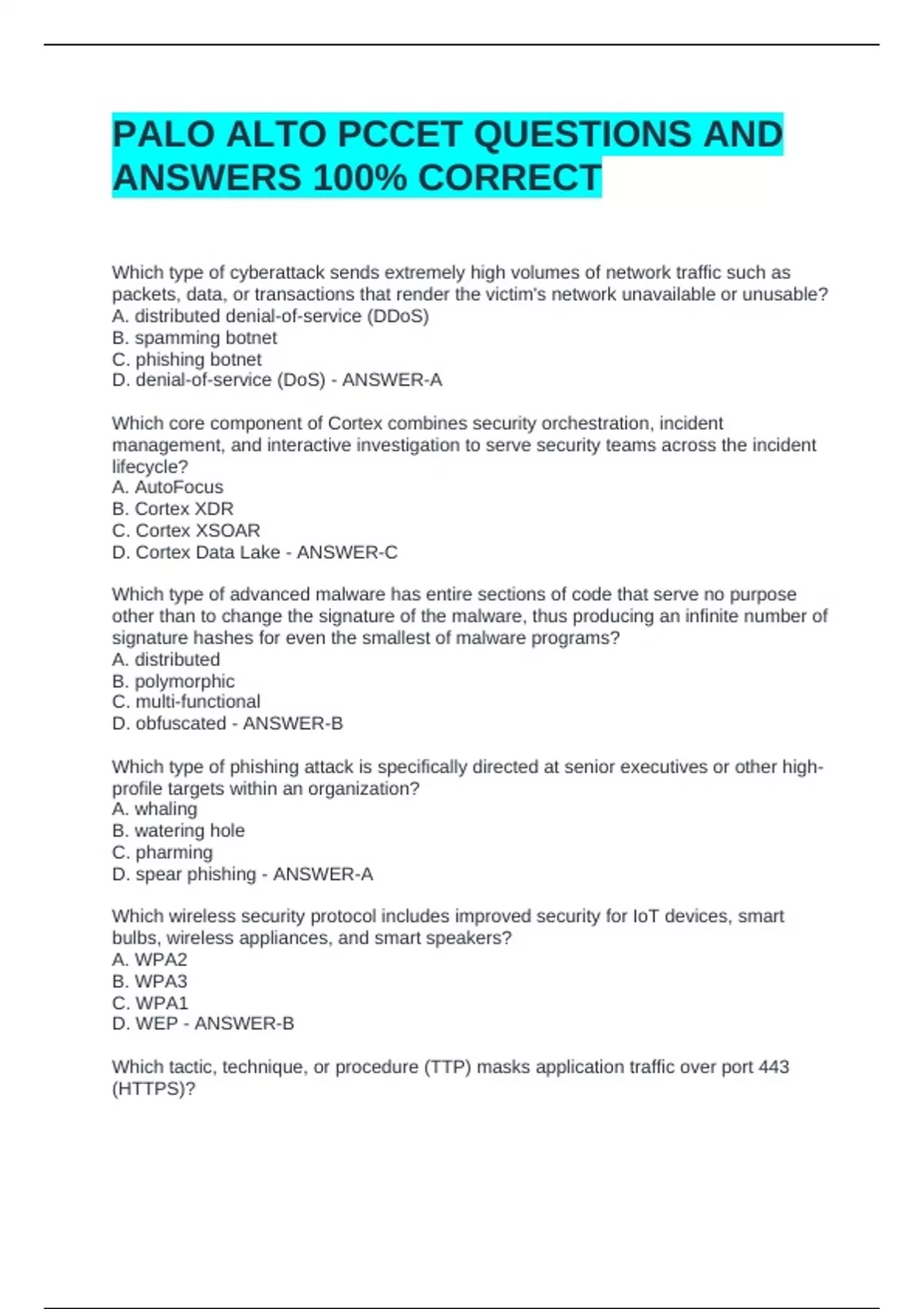 PALO ALTO PCCET QUESTIONS AND ANSWERS 100% CORRECTPALO ALTO PCCET QUESTIONS AND ANSWERS 100% CORRECTPALO ALTO PCCET QUESTIONS AND ANSWERS 100% CORRECTPALO ALTO PCCET QUESTIONS AND ANSWERS 100% CORRECT Which type of cyberattack sends extremely high volumes of network traffic such as packets, data, or transactions that render the victim's network unavailable or unusable? A. distributed denial-of-service (DDoS) B. spamming botnet C. phishing botnet D. denial-of-service (DoS) - ANSWER-A Which core component of Cortex combines security orchestration, incident management, and interactive investigation to serve security teams across the incident lifecycle? A. AutoFocus B. Cortex XDR C. Cortex XSOAR