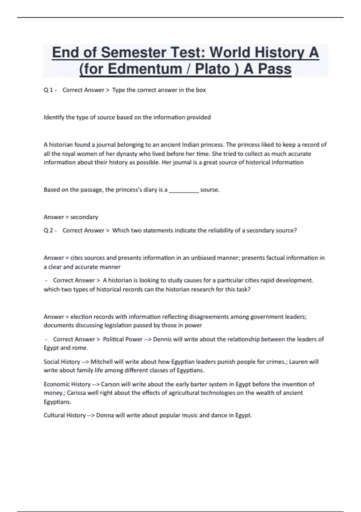 End of Semester Test: World History A (for Edmentum / Plato ) A Pass Q 1 - Correct Answer > Type the correct answer in the box Identify the type of source based on the information provided A historian found a journal belonging to an ancient Indian princess. The princess liked to keep a record of all the royal women of her dynasty who lived before her time. She tried to collect as much accurate information about their history as possible. Her joumal is a great source of historical information Based on the passage, the princess's diary is a _________ sourse. Answer = secondary Q 2 - Correct Answer > Which two statements indicate the reliability of a secondary source? Answer = cites sources and presents information in an unbiased manner; presents factual information in a clear and accurate manner - Correct Answer > A historian is looking to study causes for a particular cities rapid development. which two types of historical records can the historian research for this task? Answer = election records with information reflecting disagreements among government leaders; documents discussing legislation passed by those in power - Correct Answer > Political Power --> Dennis will write about the relationship between the leaders of Egypt and rome. Social History --> Mitchell will write about how Egyptian leaders punish people for crimes.; Lauren will write about family life among different classes of Egyptians. Economic History --> Carson will write about the early barter system in Egypt before the invention of money.; Carissa well right about the effects of agricultural technologies on the wealth of ancient Egyptians. Cultural History --> Donna will write about popular music and dance in Egypt. - Correct Answer > this pie chart shows the percentage of military deaths during world war 1 among the Allied Powers. based on the chart, what percentage of soldiers who died were Russian? Answer = 30% - Correct Answer > the scrap shows the number of shipwrecks in the Mediterranean Sea from 150 BC to AD 35. which conclusion can be drawn from the data? Answer = after 50 bc, people developed better navigation and shipbuilding methods to protect their ships. - Correct Answer > which three of the following technological advances allowed European soldiers to find routes to Asia? Answer = rutters; compasses; mapmaking - Correct Answer > this one was a map so I'm sorry I couldn't do it on Quizlet - Correct Answer > determine whether the following features belong to Maya the aztec, or both. Maya --> created an advanced system of writing Both --> practice agriculture on a large scale semicolon followed polytheistic religious beliefs Aztec --> built one of the most beautiful cities in the world - Correct Answer > which act of the conquistador Pizarro was crucial in overthrowing the Inca? Answer = the execution of the Inca ruler, Athahualpa - Correct Answer > The first stock exchange was established in ____________. brokers, merchants it, and investors met at these stock exchanges. The stock exchange helped _________ and companies raise money for their businesses. Answer = Antwerp, Belgium; merchants - Correct Answer > Why did the French consider New Orleans to be strategically important for trade during the Columbian Exchange? Answer = New Orleans was on the Mississippi River. - Correct Answer > There was a growing demand for _________ in Europe, which was used to make alcohol such as run. Political turmoil was another factor that led to grower of the slave trade, since the ________ in West Africa were constantly at war with each other. Answer = sugar; tribes and kingdoms - Correct Answer > Why did the crew of the Song ship throw some captive Africans overboard? Answer = The captives' deaths were covered by insurance. - Correct Answer > Which three ideas are specifically associated with the Renaissance? Answer = emphasis on individual growth And achievement; interest in classic Greek and Roman texts; significance of human thought and experience - Correct Answer > In what way we're artists of the Northern Renaissance different from the artists of the Italian Renaissance? Answer = They primarily painted their works using oil paint. - Correct Answer > What was the long-term effect of the European Reformation? Answer = Each country developed a system of government that agreed with it's dominant religion. - Correct Answer > The Anglican church was reestablished in England --> Elizabeth I, a Protestant who was tolerant of Catholics, became the queen of England. A new religion formed in Germany taught that salvation can be met through faith alone. --> Martin Luther writes his Ninety-Five Theses, criticizing some of the church's practices. England establishes its own church separate from the Roman Catholic Church. --> Pope Clement VII refuses to annual Henry VII's marriage to his first wife. The rulers of Germany's territories were free to decide the religion of their state. --> Holy Roman emperor Charles V declares war on Protestants in Germany. - Correct Answer > The Council of Trent condemned the _________ doctrines, which is considered as _________, and issued decrees to clarify the church's position on various _________ beliefs