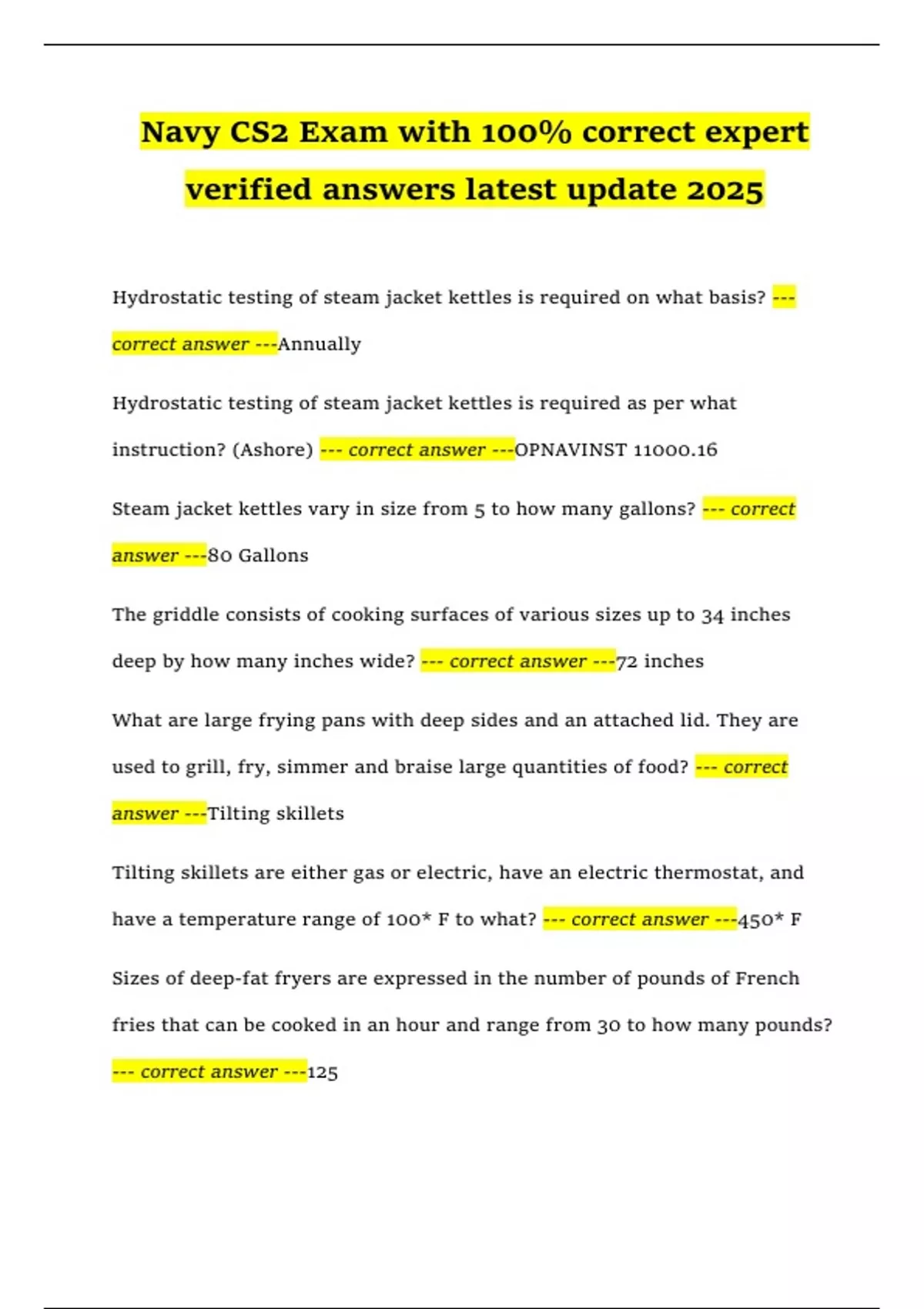 Navy CS2 Exam with 100% correct expert verified answers latest update 2025 Hydrostatic testing of steam jacket kettles is required on what basis? --- correct answer ---Annually Hydrostatic testing of steam jacket kettles is required as per what instruction? (Ashore) --- correct answer ---OPNAVINST 11000.16 Steam jacket kettles vary in size from 5 to how many gallons? --- correct answer ---80 Gallons