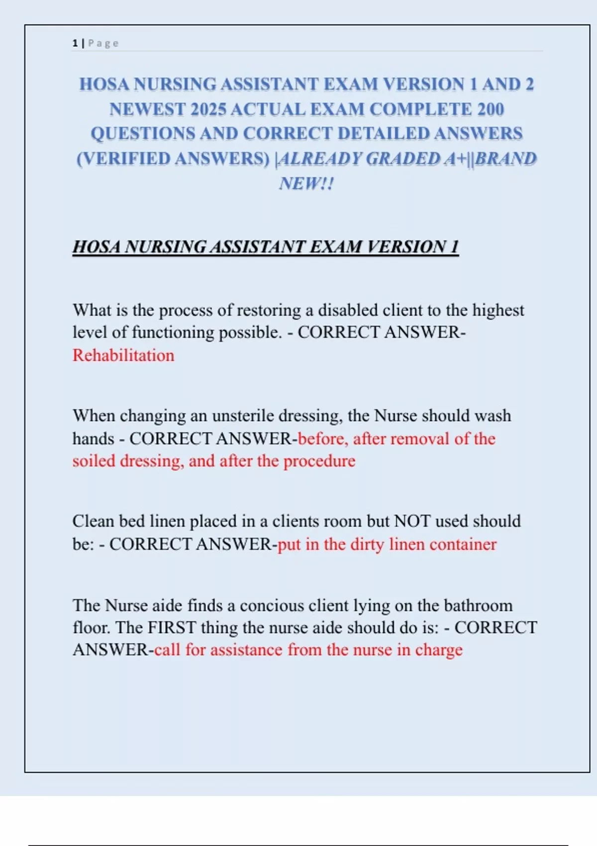 HOSA NURSING ASSISTANT EXAM VERSION 1 AND 2