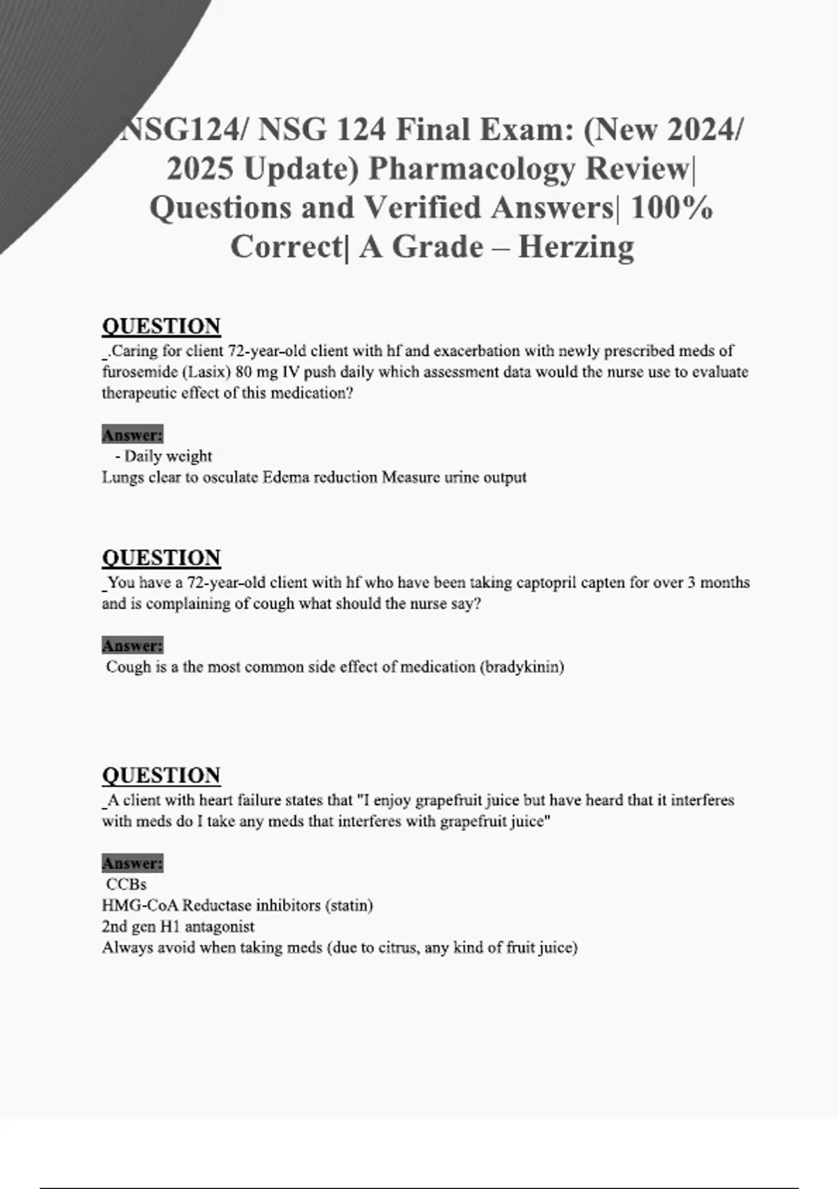 Final Exam: NSG 124 / NSG124 (NEW 2024 / 2025 Update) Pharmacology | Review with Questions and Verified Answers | 100% Correct | Graded A - Herzing