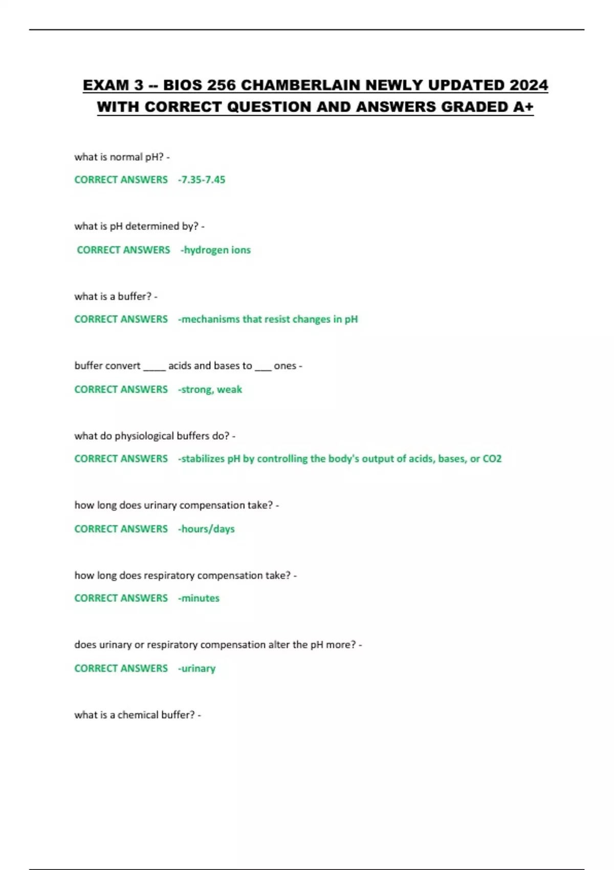 EXAM 3 -- BIOS 256 CHAMBERLAIN NEWLY UPDATED 2024 WITH CORRECT QUESTION AND ANSWERS GRADED A+ what is normal pH? - CORRECT ANSWERS -7.35-7.45 what is pH determined by? - CORRECT ANSWERS -hydrogen ions what is a buffer? - CORRECT ANSWERS -mechanisms that resist changes in pH buffer convert ____ acids and bases to ___ ones - CORRECT ANSWERS -strong, weak what do physiological buffers do? - CORRECT ANSWERS -stabilizes pH by controlling the body's output of acids, bases, or CO2 how long does urinary compensation take? - CORRECT ANSWERS -hours/days how long does respiratory compensation take? - CORRECT ANSWERS -minutes does urinary or respiratory compensation alter the pH more? - CORRECT ANSWERS -urinary what is a chemical buffer? - CORRECT ANSWERS -substance that binds H+ and removes it from solution as its concentration begins to rise how long does it take for chemical buffer systems to restore pH? - CORRECT ANSWERS -fraction of a second what are the 3 major chemical buffers in the body? - CORRECT ANSWERS -bicarbonate, phosphate, and protein what is the most abundant buffer in the ICF/blood plasma? - CORRECT ANSWERS -protein buffer system what is respiratory acidosis? - CORRECT ANSWERS -abnormally high CO2 in systemic arterial blood (about 45 mmHg) what is hypercapnia - CORRECT ANSWERS -too much CO2 a build up of CO2 causes the pH to ___ making it ___ - CORRECT ANSWERS -decrease, acidic during respiratory acidosis, the ___ will not be able to remove the CO2 produced - CORRECT ANSWERS -lungs what is respiratory alkalosis? - CORRECT ANSWERS -abnormally low CO2 in systemic arterial blood (below 35 mmHg) not enough CO2 causes the pH to ____ and become ___ - CORRECT ANSWERS -rise, alkaline what can respiratory alkalosis be caused by? - CORRECT ANSWERS -hyperventilation how does hyperventilation cause respiratory alkalosis? - CORRECT ANSWERS -breathing too fast causes a drop in CO2 levels how does the excretion of hydrogen ions by the kidneys control blood pH? - CORRECT ANSWERS -kidneys neutralize more acid/base than the respiratory system (if acid is too high, kidneys secrete more H+ to raise pH