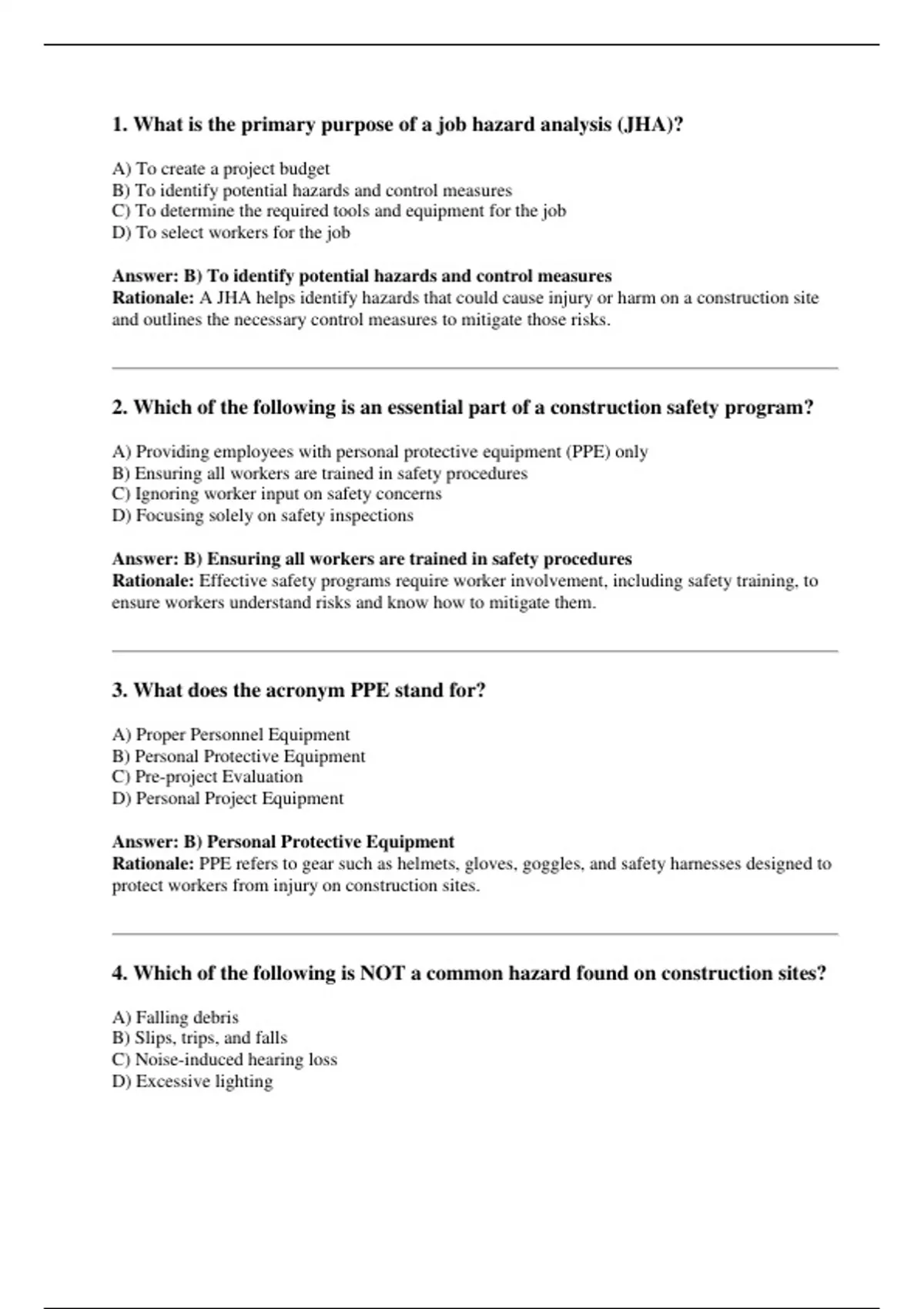 Rationale: A JHA helps identify hazards that could cause injury or harm on a construction site