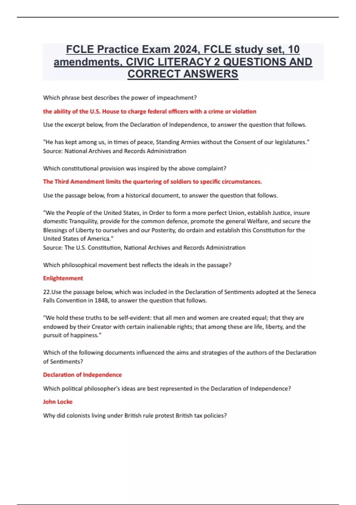 FCLE Practice Exam 2024, FCLE study set, 10 amendments, CIVIC LITERACY 2 QUESTIONS AND CORRECT ANSWERS Which phrase best describes the power of impeachment? the ability of the U.S. House to charge federal officers with a crime or violation Use the excerpt below, from the Declaration of Independence, to answer the question that follows. "He has kept among us, in times of peace, Standing Armies without the Consent of our legislatures." Source: National Archives and Records Administration Which constitutional provision was inspired by the above complaint? The Third Amendment limits the quartering of soldiers to specific circumstances. Use the passage below, from a historical document, to answer the question that follows. "We the People of the United States, in Order to form a more perfect Union, establish Justice, insure domestic Tranquility, provide for the common defence, promote the general Welfare, and secure the Blessings of Liberty to ourselves and our Posterity, do ordain and establish this Constitution for the United States of America." Source: The U.S. Constitution, National Archives and Records Administration Which philosophical movement best reflects the ideals in the passage? Enlightenment 22.Use the passage below, which was included in the Declaration of Sentiments adopted at the Seneca Falls Convention in 1848, to answer the question that follows. "We hold these truths to be self-evident: that all men and women are created equal; that they are endowed by their Creator with certain inalienable rights; that among these are life, liberty, and the pursuit of happiness." Which of the following documents influenced the aims and strategies of the authors of the Declaration of Sentiments? Declaration of Independence Which political philosopher's ideas are best represented in the Declaration of Independence? John Locke Why did colonists living under British rule protest British tax policies? The colonists claimed that the tax policies violated their political rights. In the Mayflower Compact, Plymouth settlers pledged to unite into "a civil body politic" and agreed to make and abide by laws that "insured the general Good of the Colony." What founding document did this set a precedent for? U.S. Constitution Which person is considered to be the principal author of the U.S. Constitution? James Madison Government by the people and the separation of powers are the main principles of which founding document? U.S. Constitution Use the excerpt below, from the Thirteenth Amendment, to answer the question that follows. "Neither slavery nor involuntary servitude, except as a punishment for crime whereof the party shall have been duly convicted, shall exist within the United States, or any place subject to their jurisdiction." Which of the following contains a clause that may have served as an inspiration for the above language? Northwest Ordinances The Mayflower Compact includes a pledge to ensure that all citizens look out for the general good of the colony. Based on this, what impact has the Mayflower Compact had on modern understanding of the purpose of government in the United States? The government should provide equal protection under the law. At the Constitutional Convention, there was a major debate between large states and small states about representation in the new Congress. This debate was resolved by the Great Compromise. What was the result of this compromise? Congress would have two houses, one in which state representation was based on population and one in which all states had equal representation. Which of the following reflects the most important consequence of the Watergate break-in? resignation of the president of the United States Which legislation reflects federal efforts to regulate transportation? Interstate Commerce Act The U.S. Supreme Court enabled which government practices to continue in its ruling in Plessy v. Ferguson? segregating public facilities Which of the following ancient civilizations established a republican form of government? Roman During the 6th century B.C.E., the ancient Athenians divided the powers of their government between two assemblies and guaranteed certain political rights to all male citizens. How do these political reforms best illustrate how societies develop? by limiting government authority A certain country is characterized by the following traits: 1. power achieved through inheritance 2. same ruling family for over a century 3. finite freedoms and rights 4. hierarchical social status 5. single established state religion The establishment and maintenance of these traits is based on which of the following principles? divine right of kings Which modern democratic concept practiced in the United States is most like the democratic process of ancient Greece? the referendum What is the principal function of a written constitution? outlining the structure and powers of a government Which of the following objectives best describes the purpose of the system of checks and balances, as defined in the U.S. Constitution? keeping any one of the three branches of government from becoming too powerful Which modern process would be supported by the ancient Greeks? electing governors Laws against defamation, including libel and slander, property damage and breach of contract represent which legal concern underlying most Western nations? civil law Use the passage below, from an exchange between former president Nixon and a television interviewer, to answer the question that follows. "Well, when the president does it, that means that it is not illegal"--Richard M. Nixon Which constitutional principle does the statement from President Nixon contradict? rule of law Which form of government is based on popular sovereignty? republic Use the provided Preamble to the United States Constitution to answer the question. "We the People of the United States, in Order to form a more perfect Union, establish Justice, insure domestic Tranquility, provide for the common d