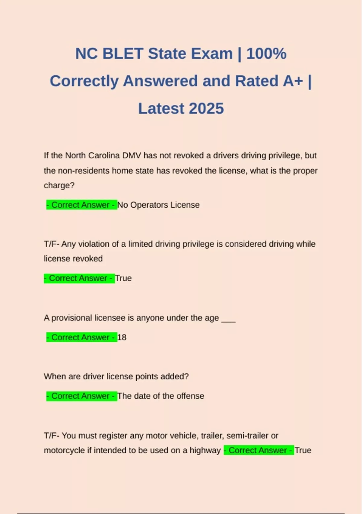 NC BLET State Exam | 100% Correctly Answered and Rated A+ | Latest 2025