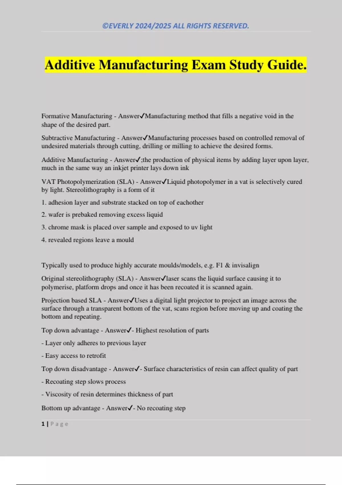 Additive Manufacturing Exam Study Guide. Formative Manufacturing - AnswerManufacturing method that fills a negative void in the shape of the desired part. Subtractive Manufacturing - AnswerManufacturing processes based on controlled removal of undesired materials through cutting, drilling or milling to achieve the desired forms. Additive Manufacturing - Answer;the production of physical items by adding layer upon layer, much in the same way an inkjet printer lays down ink VAT Photopolymerization (SLA) - AnswerLiquid photopolymer in a vat is selectively cured by light. Stereolithography is a form of it 1. adhesion layer and substrate stacked on top of eachother 2. wafer is prebaked removing excess liquid 3. chrome mask is placed over sample and exposed to uv light 4. revealed regions leave a mould Typically used to produce highly accurate moulds/models, e.g. F1 & invisalign Original stereolithography (SLA) - Answerlaser scans the liquid surface causing it to polymerise, platform drops and once it has been recoated it is scanned again. Projection based SLA - AnswerUses a digital light projector to project an image across the surface through a transparent bottom of the vat, scans region before moving up and coating the bottom and repeating. Top down advantage - Answer- Highest resolution of parts - Layer only adheres to previous layer - Easy access to retrofit Top down disadvantage - Answer- Surface characteristics of resin can affect quality of part - Recoating step slows process - Viscosity of resin determines thickness of part Bottom up advantage - Answer- No recoating step ©EVERLY 2024/2025 ALL RIGHTS RESERVED. 2 | P a g e - Ultrathin layers are possible - Less wasted material Bottom up disadvantage - Answer- Light has to pass through more surfaces, reducing intensity - Current layer adhering to vat can damage part - Hard to retrofit Light curable resins - AnswerConsist of a monomer, photoinitiator and an inhibator. The photoinitiator is excited by UV producing free radicals, this causes the monomers to link into polymers. Post curing - AnswerUV Curing to ensure complete polymerisation and cross linking of polymer bonds, if not complete mechanical integrity is at risk. Dependent on the mass and material of the part, requires moving in the chamber. Vat Photopolymerization Advantages - Answer- Accurate, small feature size and small layer thickness - Good surface finish - Parts can be treated - Large volumes possible - Easy to remove support structures before final curing - Lower density infill can be used for investment casting - Low input energy VAT Photopolymerization Disadvantages - Answer- Expensive machines - Expensive materials to run (full vat of resin) - Support structures are required - Resins are toxic and require h&s - Hygroscopic, parts not stable over time and age in sunlight - Thorough cleaning needed to swap materials in machine - Part orientation worse on bottom than top Material Extrusion - AnswerMaterial is selectively dispensed through a nozzle by an act of pressure. Fused Filament Fabrication (FFF) - AnswerThermoplastic filament is pushed through a hot nozzle which liquifies the filament through the nozzle. Requires support materials for overhangs, can be removed mechanically or someti