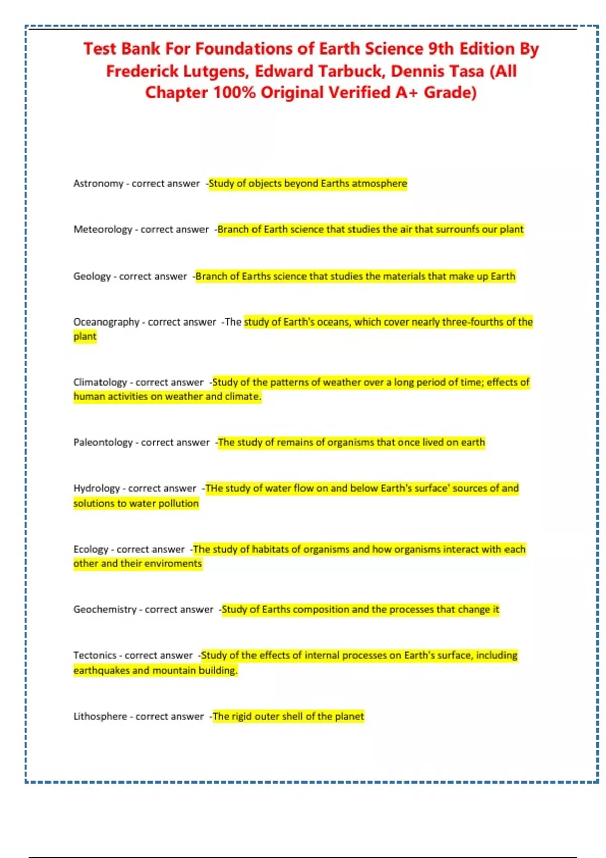 , Test Bank For Foundations of Earth Science 9th Edition By