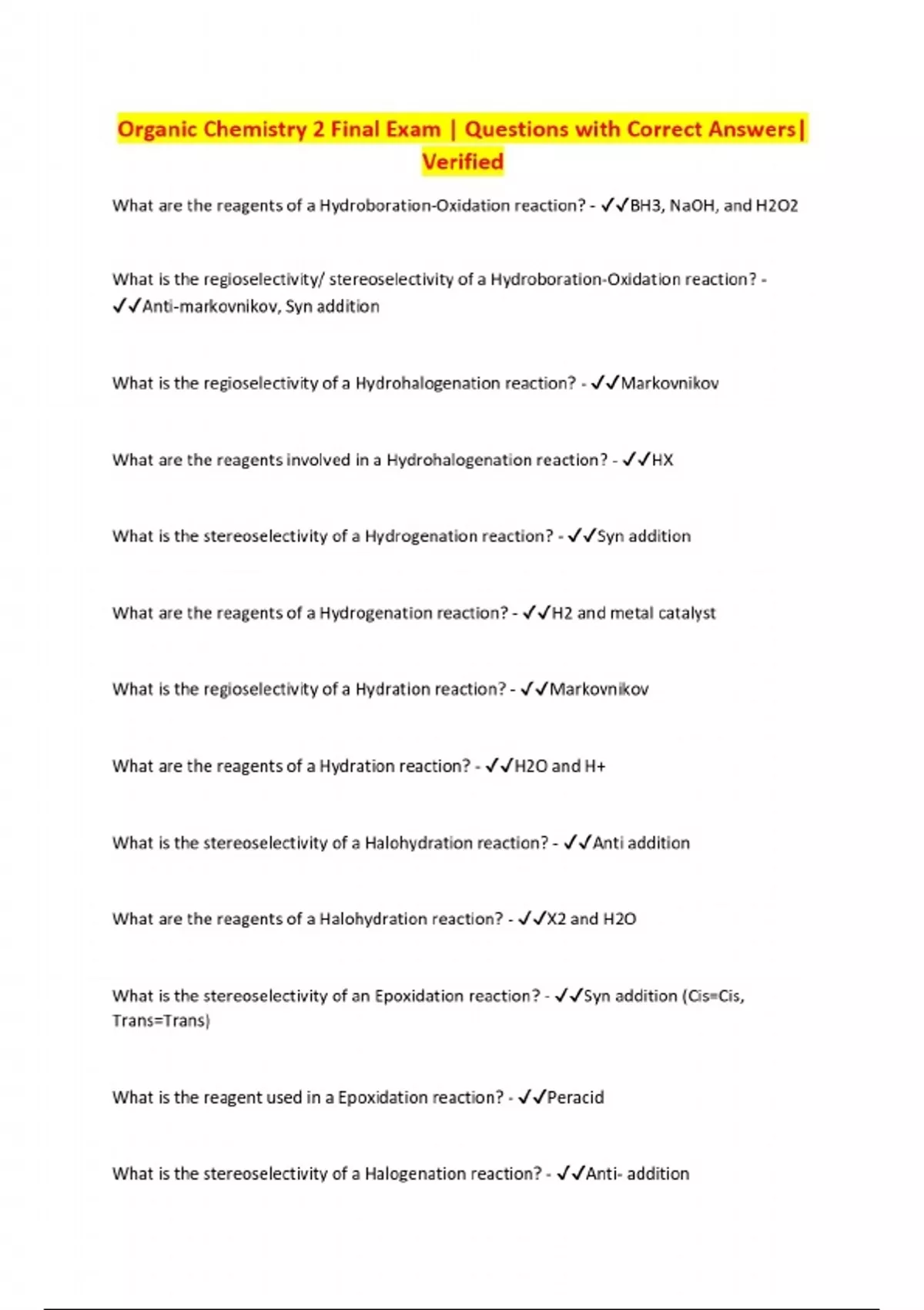 Organic Chemistry 2 Final Exam | Questions with Correct Answers| Verified