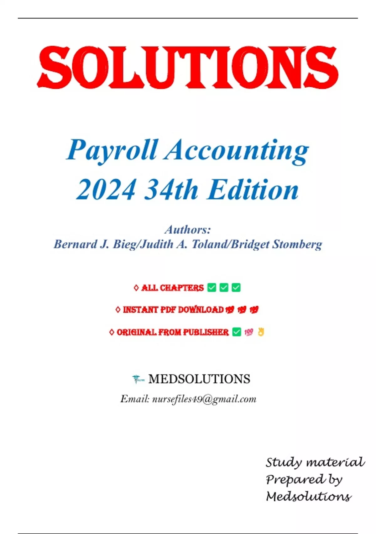 Solution Manual for Payroll Accounting 2024 Landin 34th Edition by Bernard J. Bieg and Bridget Stomberg. Full Chapters Include;....1. The Need for Payroll and Personal Records. 2. Computing Wages and Salaries. 3. Social Security Taxes. 4. Income Tax Withholding. 5. Unemployment Compensation Taxes. 6. Analyzing and Journalizing Payroll. 7. Payroll Project.