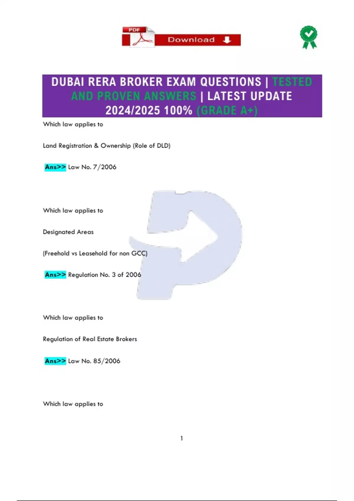 DUBAI RERA BROKER EXAM QUESTIONS | TESTED AND PROVEN ANSWERS | LATEST UPDATE 2024/2025 100% (GRADE A+)