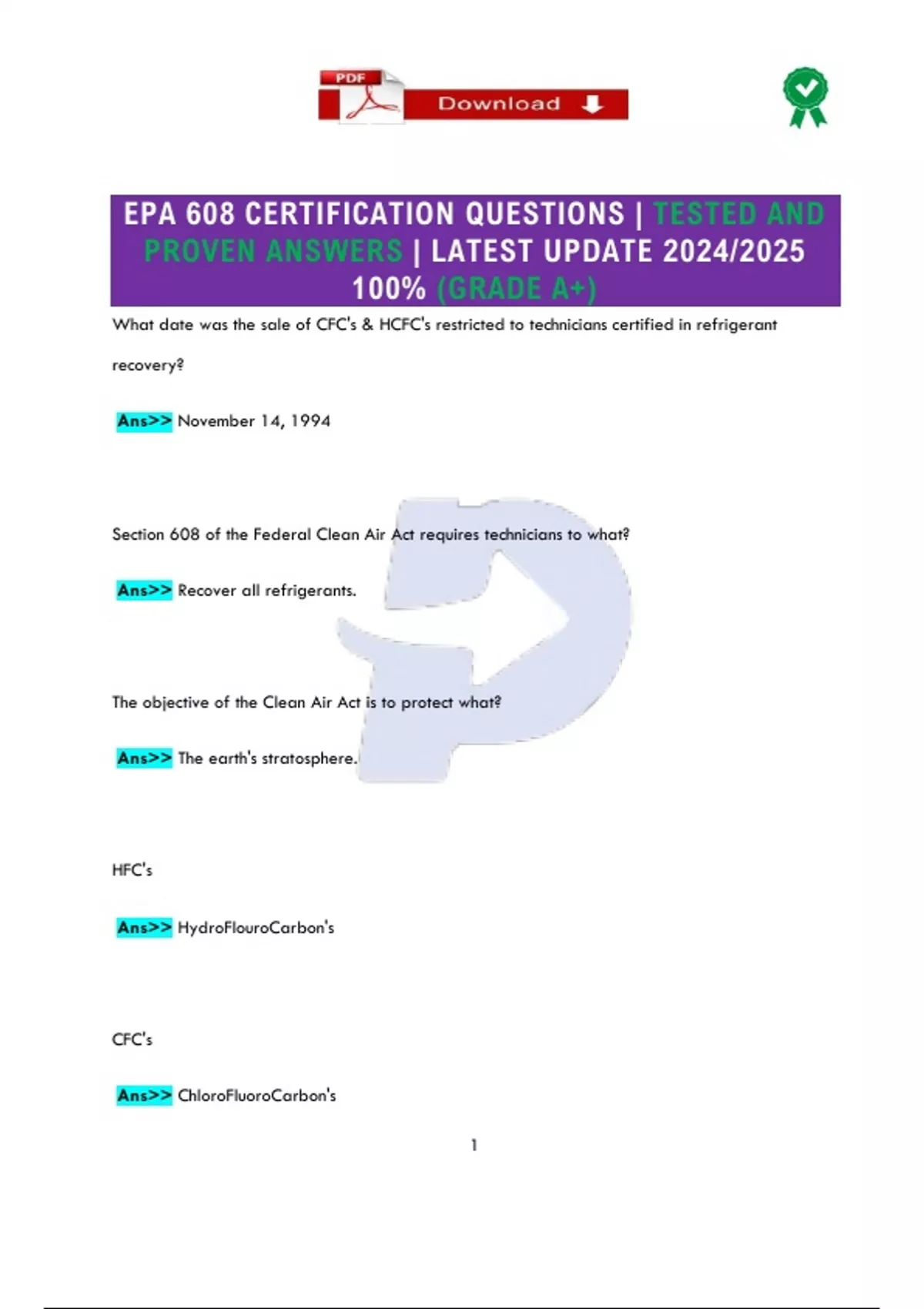 EPA 608 CERTIFICATION QUESTIONS | TESTED AND PROVEN ANSWERS | LATEST UPDATE 2024/2025 100% (GRADE A+) EPA 608 CERTIFICATION QUESTIONS | TESTED AND PROVEN ANSWERS | LATEST UPDATE 2024/2025 100% (GRADE A+)