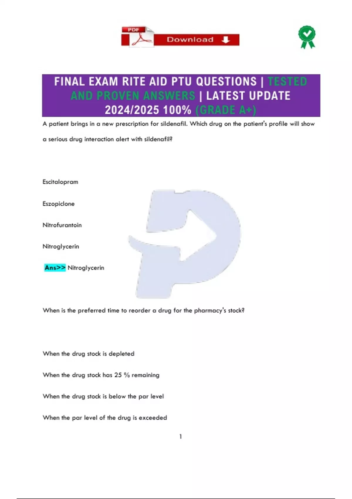 FINAL EXAM RITE AID PTU QUESTIONS | TESTED AND PROVEN ANSWERS | LATEST UPDATE 2024/2025 100% (GRADE A+) FINAL EXAM RITE AID PTU QUESTIONS | TESTED AND PROVEN ANSWERS | LATEST UPDATE 2024/2025 100% (GRADE A+)