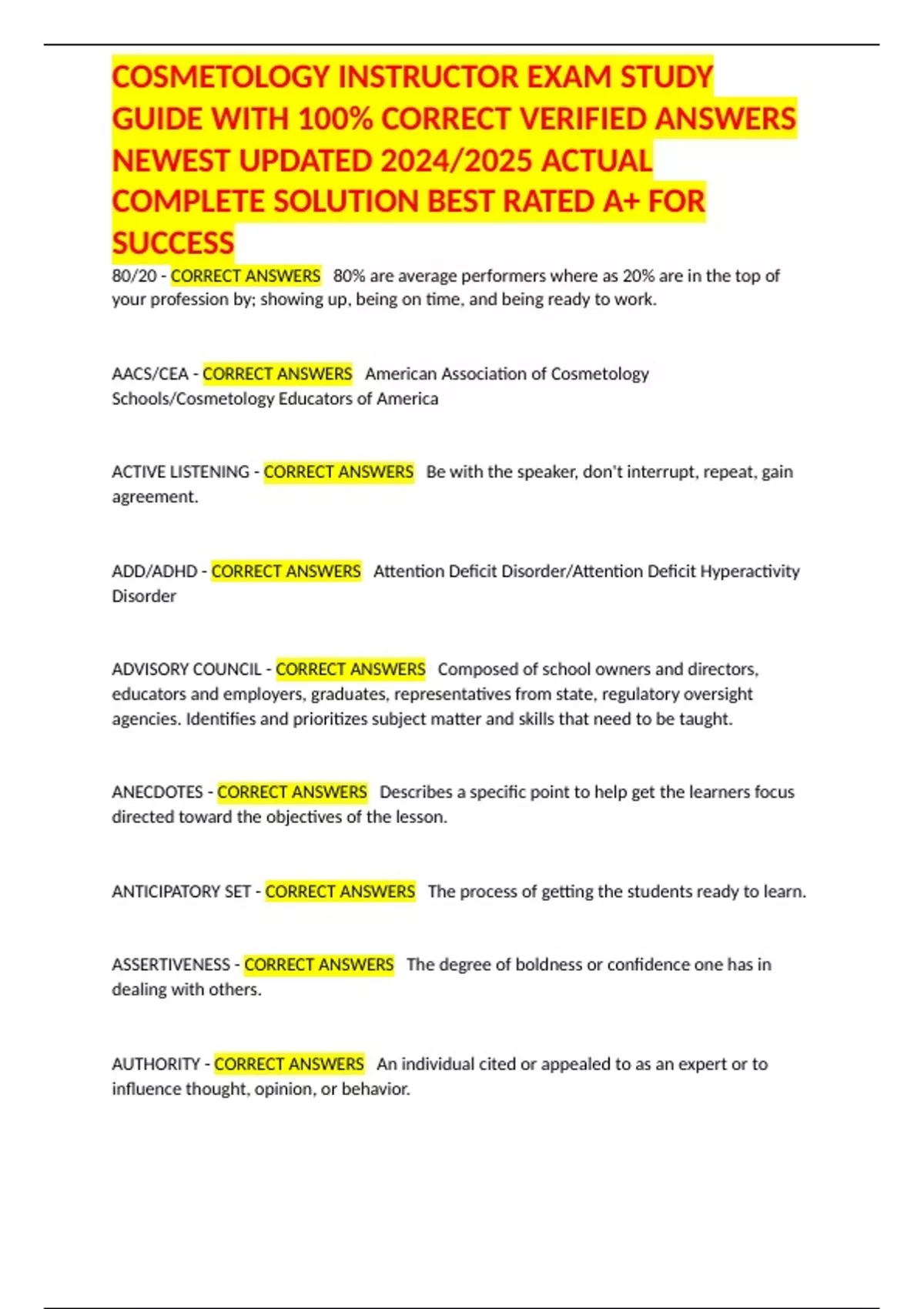 COSMETOLOGY INSTRUCTOR EXAM STUDY GUIDE WITH 100% CORRECT VERIFIED ANSWERS NEWEST UPDATED 2024/2025 ACTUAL COMPLETE SOLUTION BEST RATED A+ FOR SUCCESS