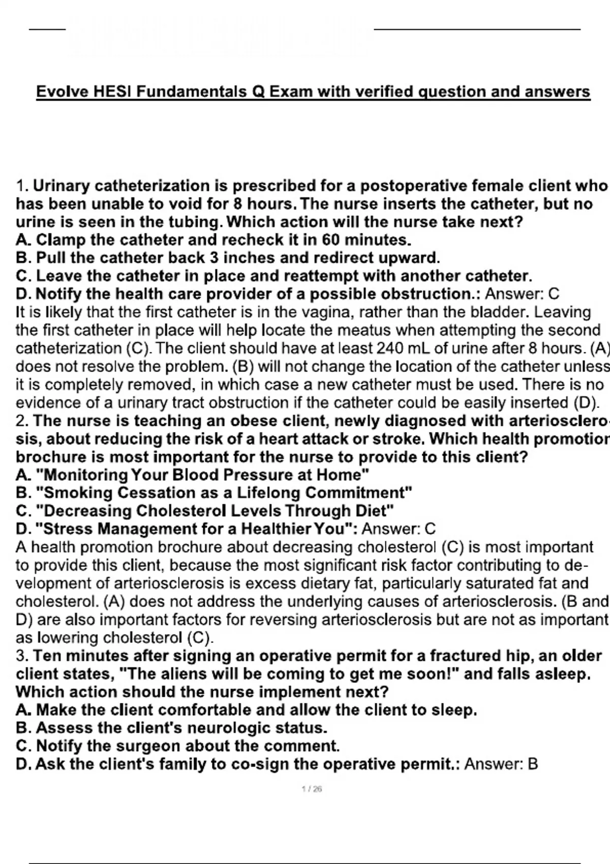 Evolve HESI Fundamentals Q Exam with verified question and answers 1. Urinary catheterization is prescribed for a postoperative female client who has been unable to void for 8 hours. The nurse inserts the catheter, but no urine is seen in the tubing. Which action will the nurse take next? A. Clamp the catheter and recheck it in 60 minutes. B. Pull the catheter back 3 inches and redirect upward. C. Leave the catheter in place and reattempt with another catheter. D. Notify the health care provider of a possible obstruction.: Answer: C It is likely that the first catheter is in the vagina, rather than the bladder. Leaving the first catheter in place will help locate the meatus when attempting the second catheterization (C).The client should have at least 240 mL of urine after 8 hours. (A) does not resolve the problem. (B) will not change the location of the catheter unless it is completely removed, in which case a new catheter must be used. There is no evidence of a urinary tract obstruction if the catheter could be easily inserted (D