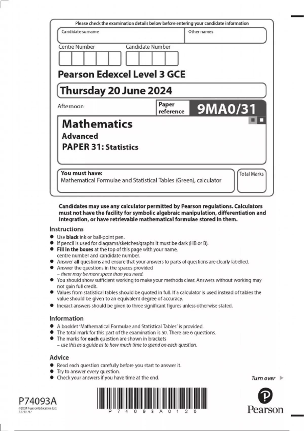 A-Level EDEXCEL 2025 Mathematics Paper 31: Statistics