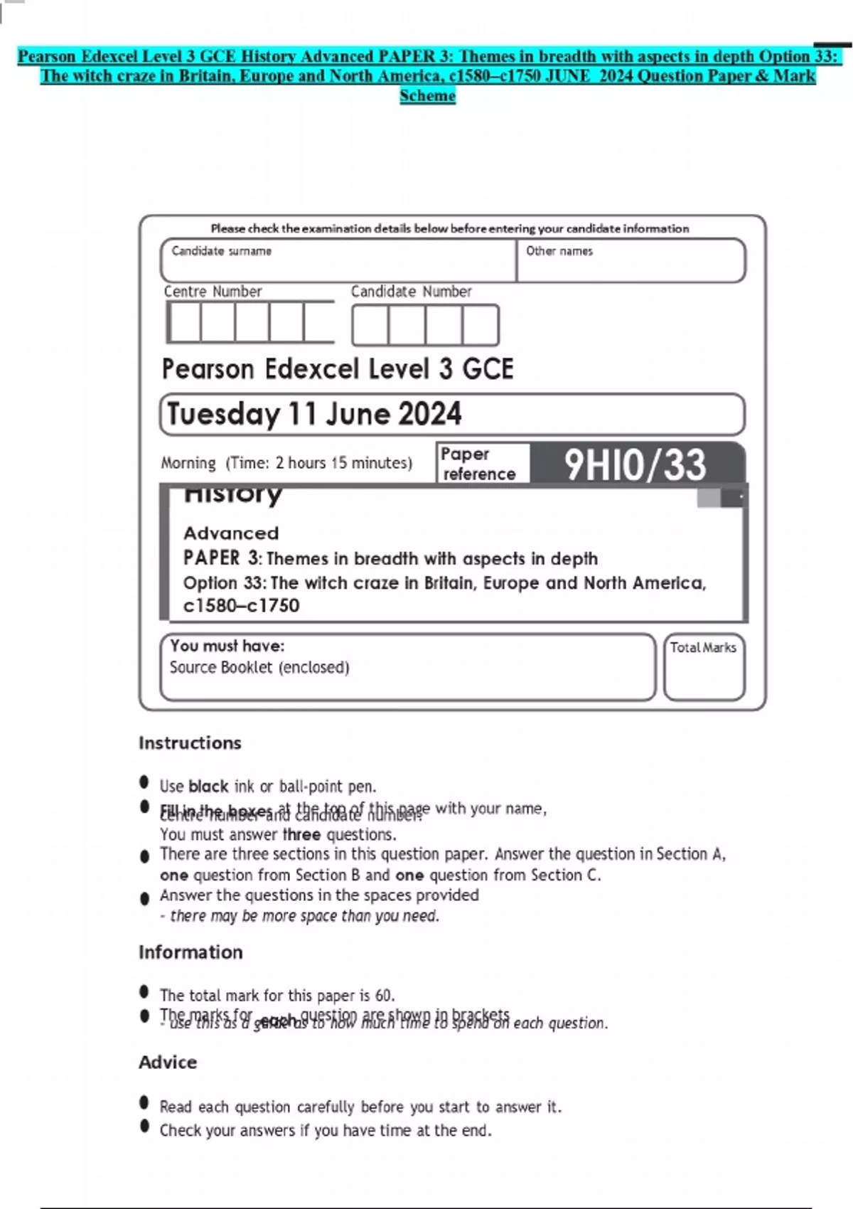 Pearson Edexcel Level 3 GCE History Advanced PAPER 3: Themes in breadth with aspects in depth Option 33: The witch craze in Britain, Europe and North America, c1580–c1750 JUNE 2024 Question Paper & Mark Scheme