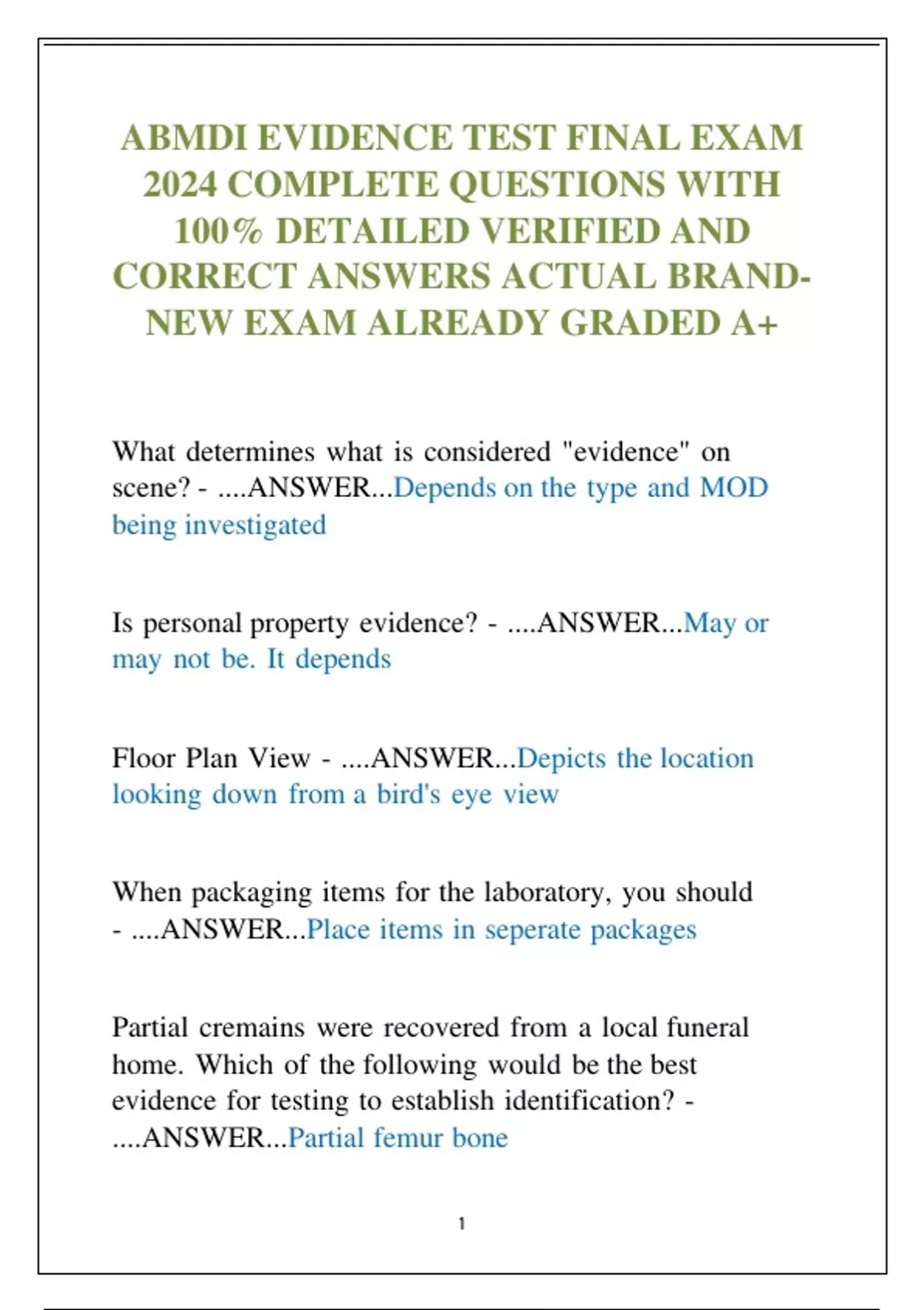 ABMDI EVIDENCE TEST FINAL EXAM 2024 COMPLETE QUESTIONS WITH 100% DETAILED VERIFIED AND CORRECT ANSWERS ACTUAL BRANDNEW EXAM ALREADY GRADED A+