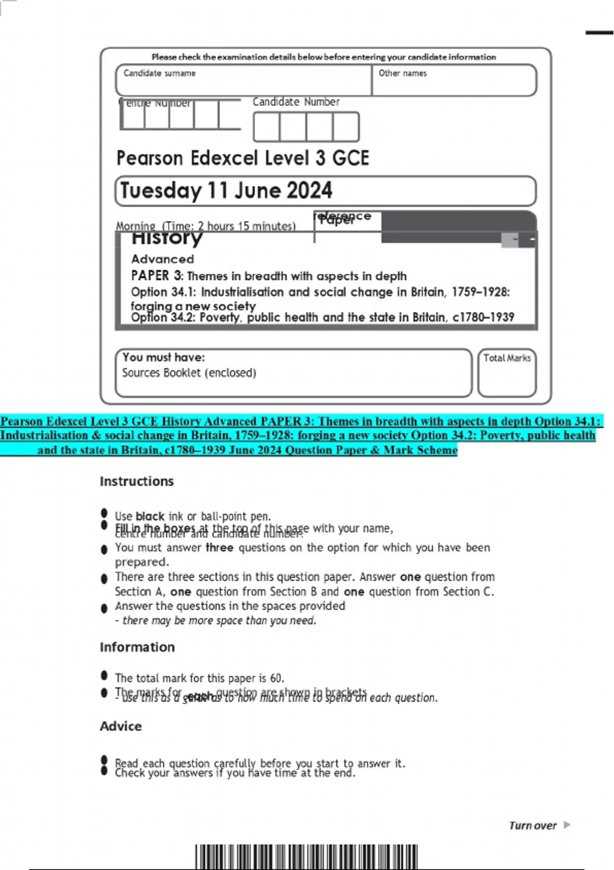 Pearson Edexcel Level 3 GCE History Advanced PAPER 3: Themes in breadth with aspects in depth Option 34.1: Industrialisation & social change in Britain, 1759–1928: forging a new society Option 34.2: Poverty, public health and the state in Britain, c1780–1939 June 2024 Question Paper & Mark Scheme