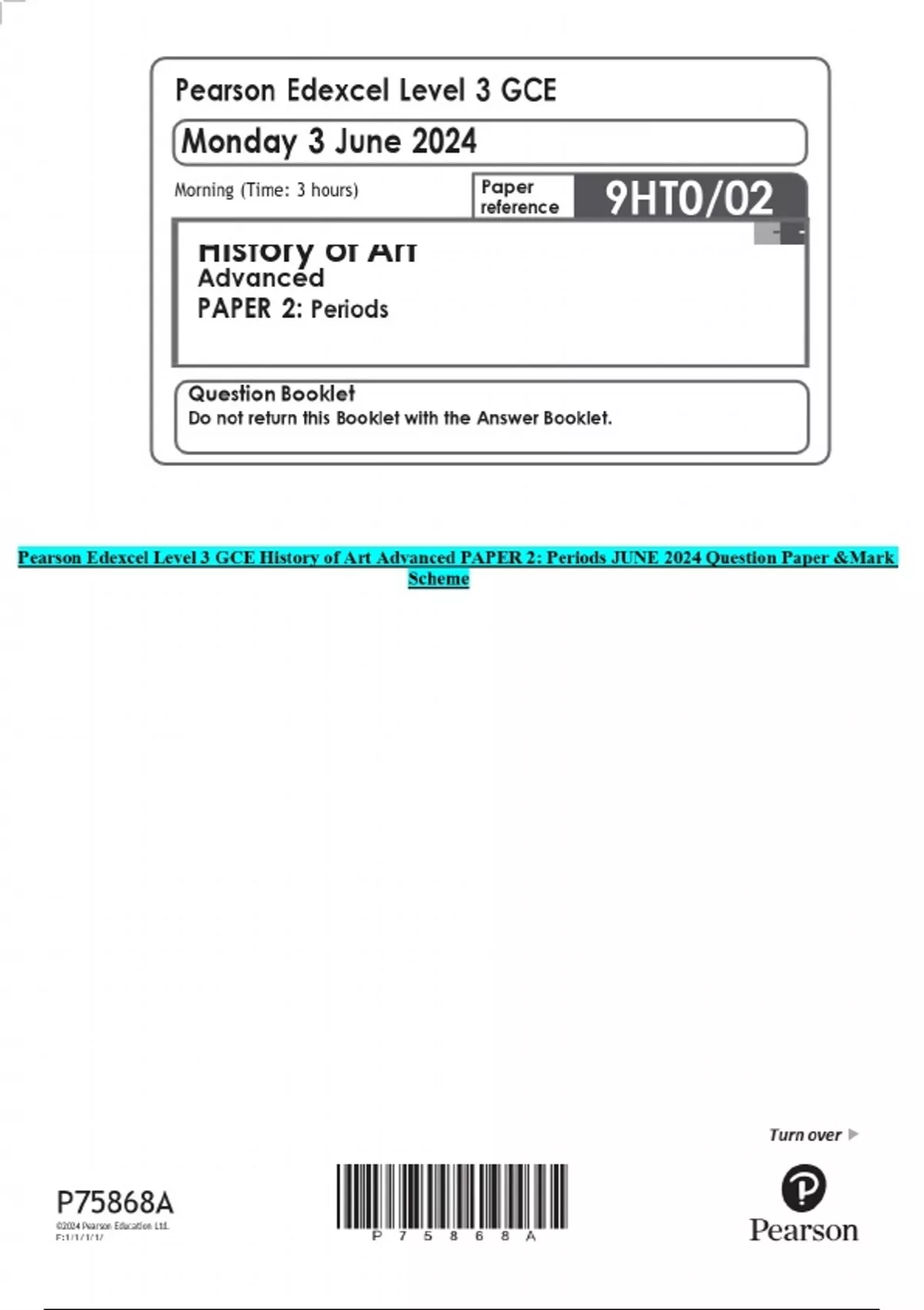 Pearson Edexcel Level 3 GCE History of Art Advanced PAPER 2: Periods JUNE 2024 Question Paper &Mark Scheme