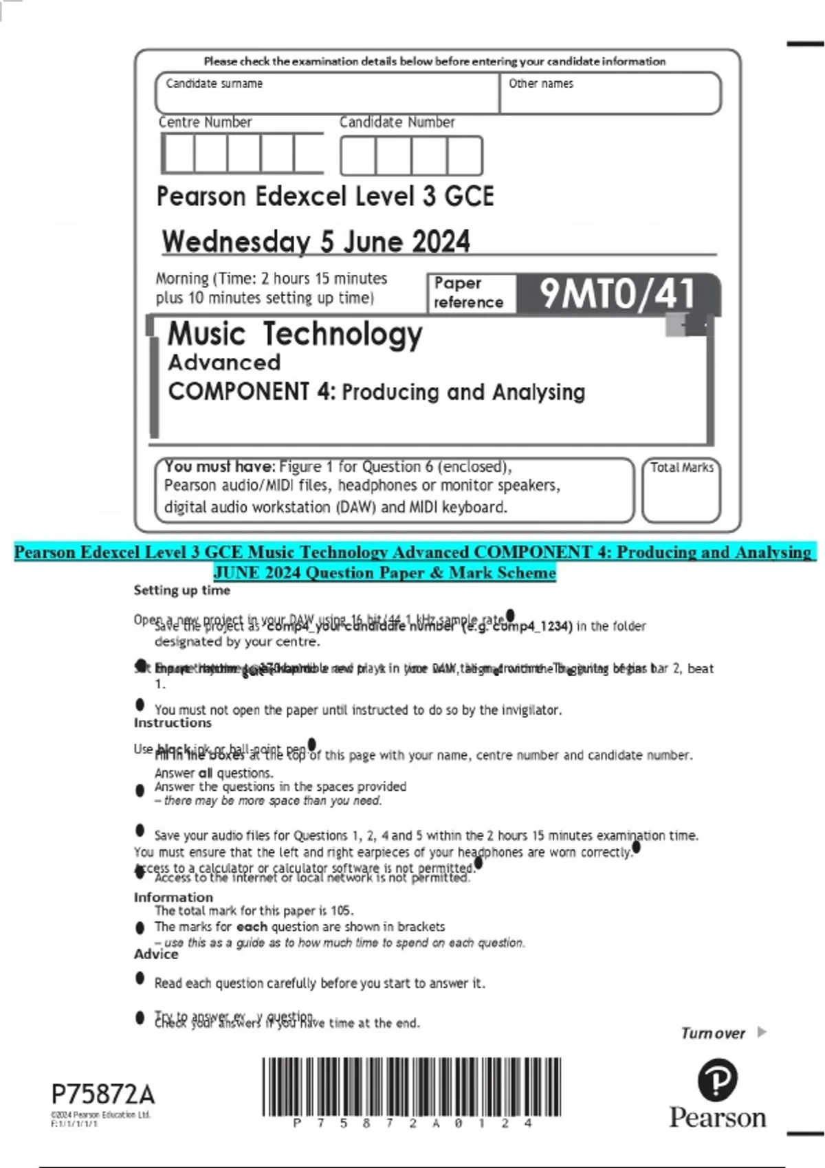 Pearson Edexcel Level 3 GCE Music Technology Advanced COMPONENT 4: Producing and Analysing JUNE 2024 Question Paper & Mark Scheme