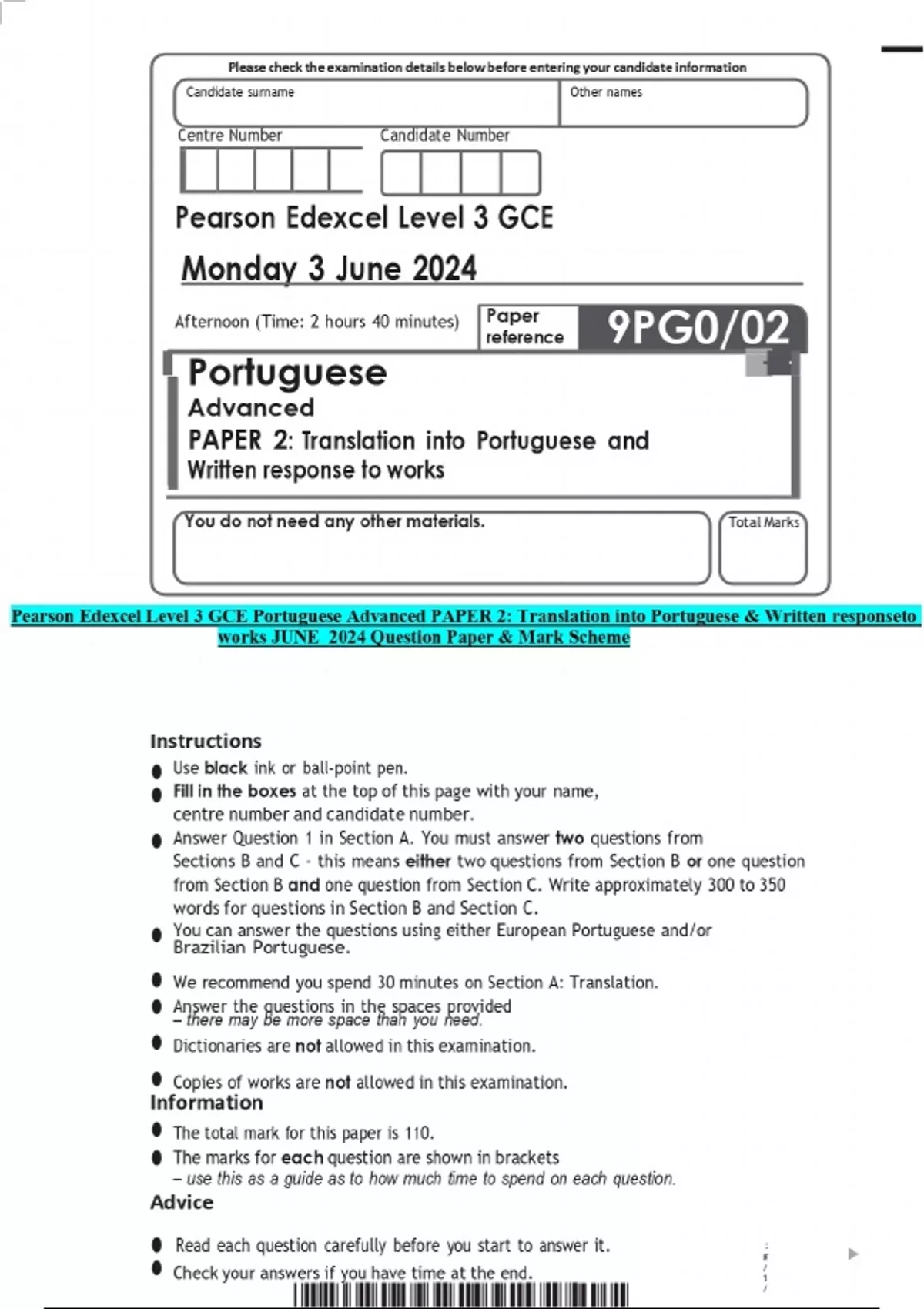 Pearson Edexcel Level 3 GCE Portuguese Advanced PAPER 2: Translation into Portuguese & Written responseto works JUNE 2024 Question Paper & Mark Scheme